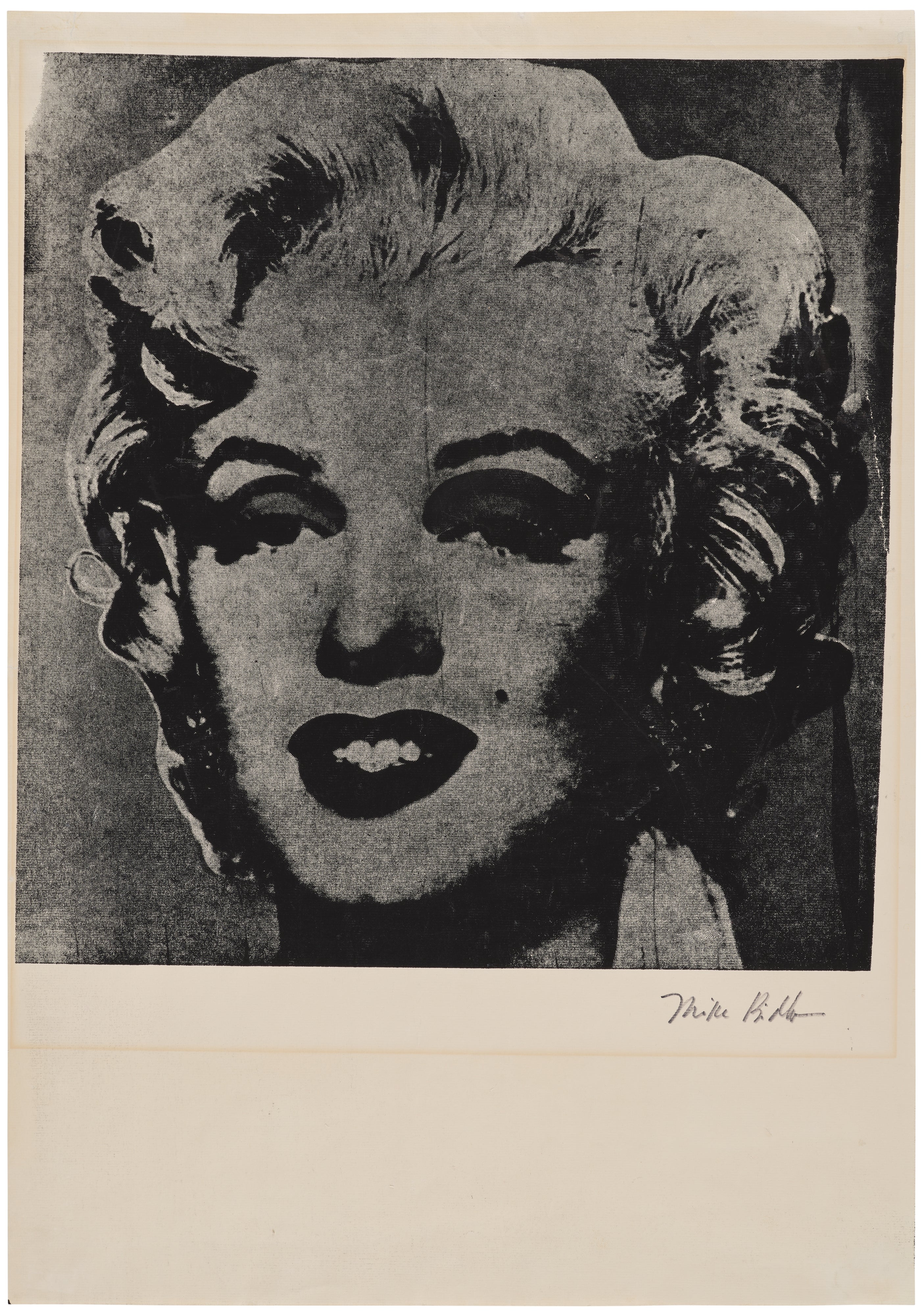 Mike Bidlo's *Not Warhol (Marilyn)* is a screenprint on laid paper that boldly appropriates Andy Warhol's iconic portrait of Marilyn Monroe, challenging notions of authorship, originality, and artistic identity. By reproducing one of the most recognizable images in pop art history and stamping it with his own name, Bidlo raises provocative questions about authenticity and the nature of artistic genius. The work is a key example of the appropriation art movement, blurring the line between homage and subversion.