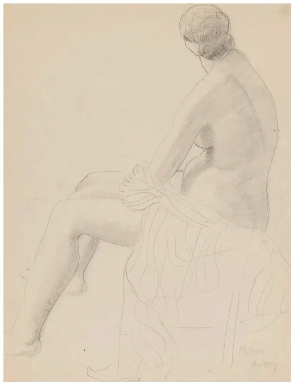 A figurative pencil drawing depicting a reclining nude figure with draped fabric, executed with subtle shading and refined linework. The composition demonstrates Avery's characteristic approach to the human form with careful attention to form and restraint.