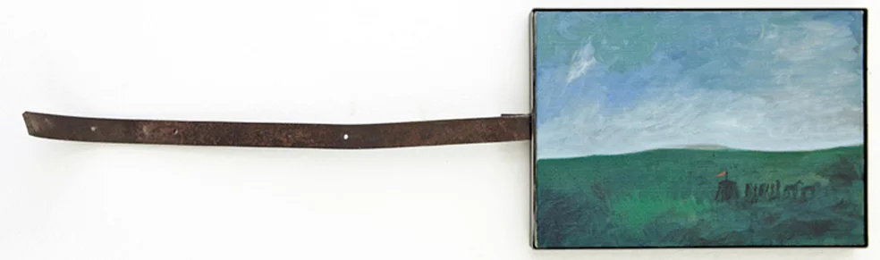 This oil on canvas work presents a layered landscape composition framed with iron, exploring the tension between artistic creation and constraint. The painting engages with allegorical and symbolic forms characteristic of the Transavanguardia movement, where the landscape becomes a vehicle for deeper conceptual inquiry. The iron frame functions as both structural support and metaphorical barrier, echoing the artist's philosophy that finished works simultaneously liberate and confine artistic vision. The piece demonstrates Paladino's synthesis of material exploration with figurative language, creating a visual dialogue between internal intuition and external form. Through its composed yet dynamic surface, the work invites contemplation of how artistic ideas emerge from concealment into material reality.