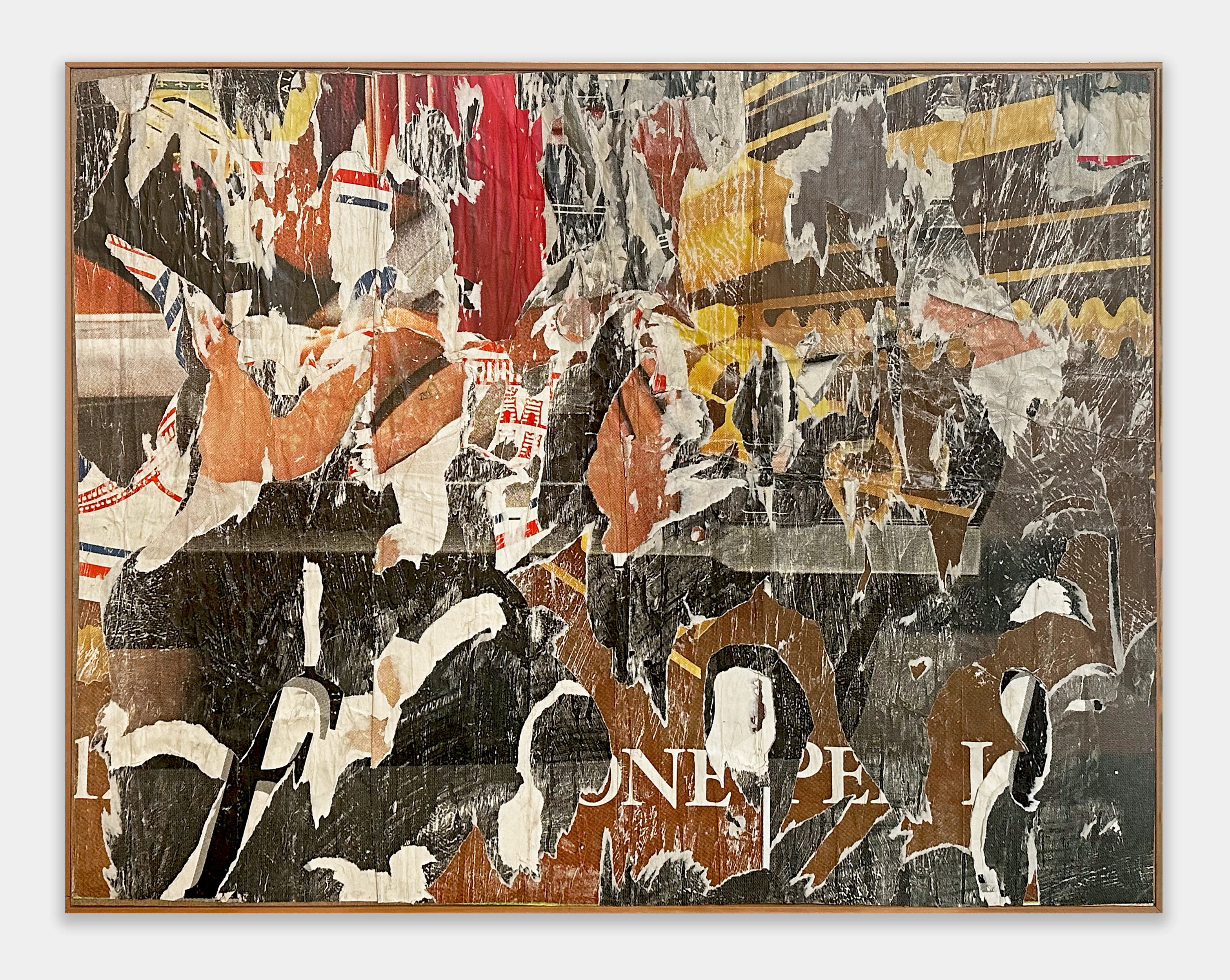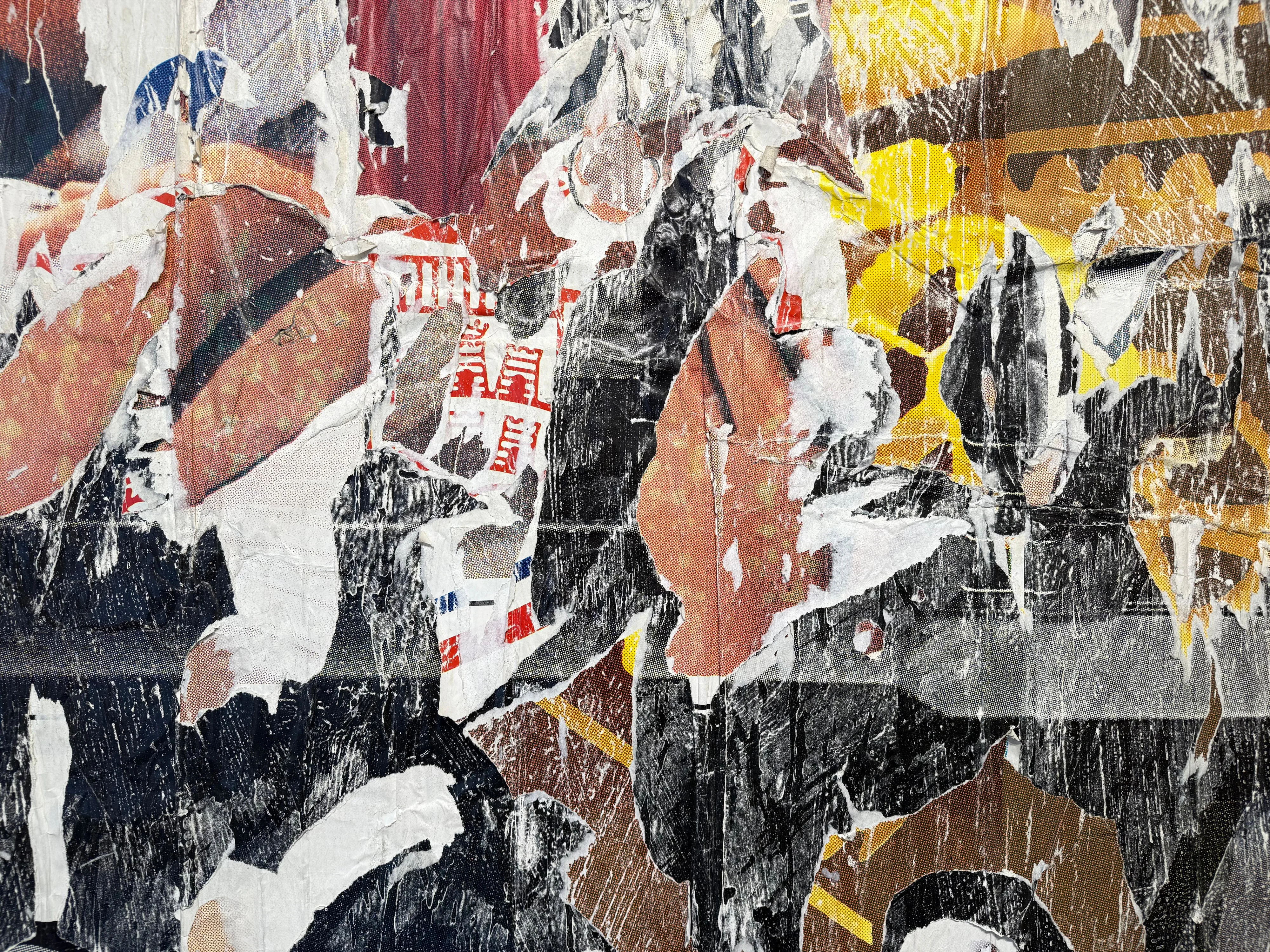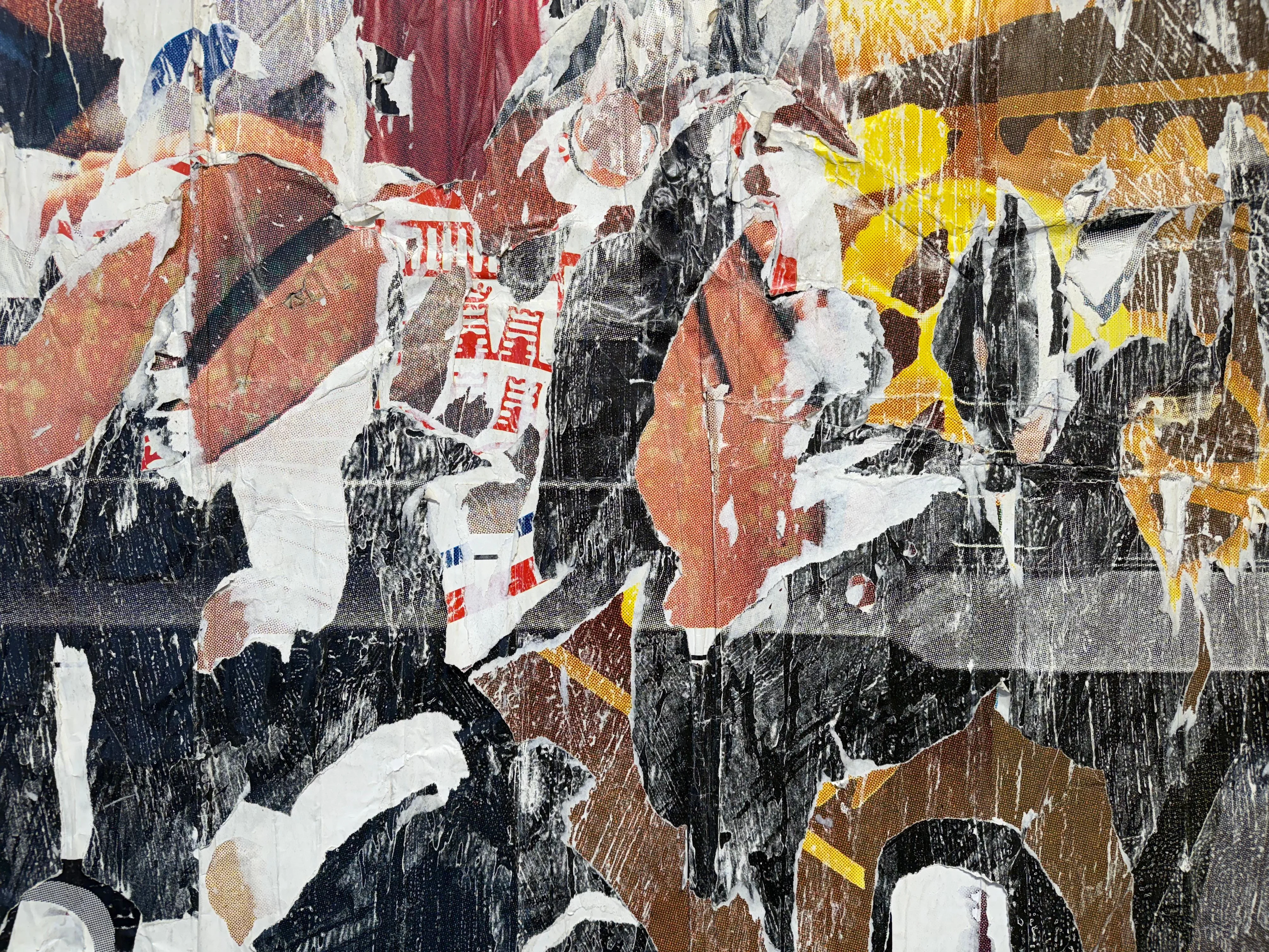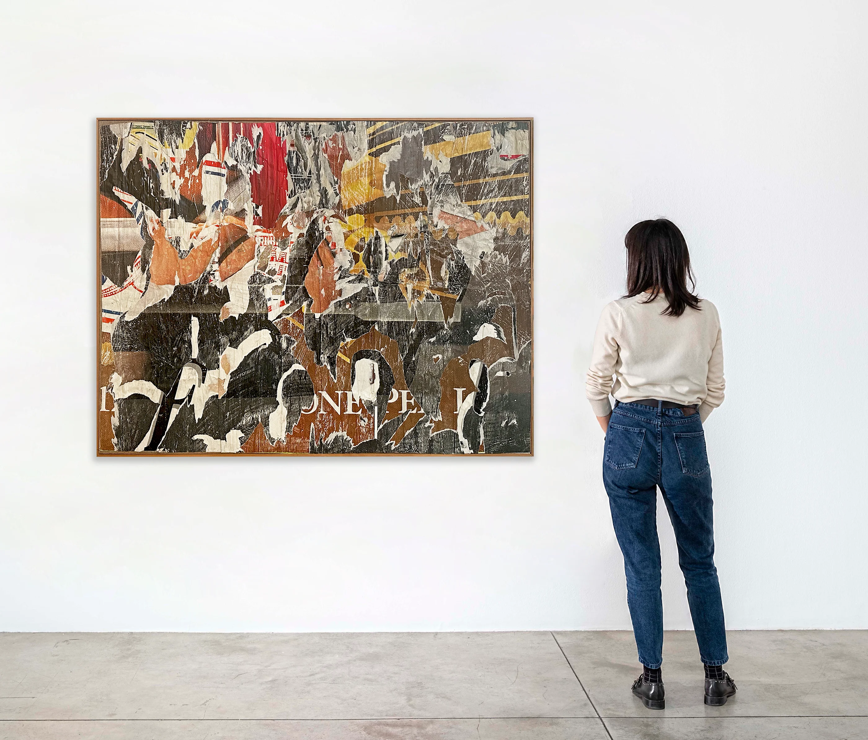 This decollage work appropriates and manipulates urban posters to construct a visual commentary on metropolitan life and social critique. By systematically tearing and reassembling found poster fragments, Rotella transforms commercial and public imagery into a vehicle for artistic protest against cultural stagnation. The layered composition reveals the archaeological strata of the city's visual environment, where successive advertisements create an unintended palimpsest of consumer and political messaging. Rather than employing the posters for aesthetic composition alone, the artist harnesses their symbolic and content value to articulate a position against societal complacency. The work exemplifies Decollage as a method of material subversion, where destruction and recombination become acts of creative resistance and reimagination.