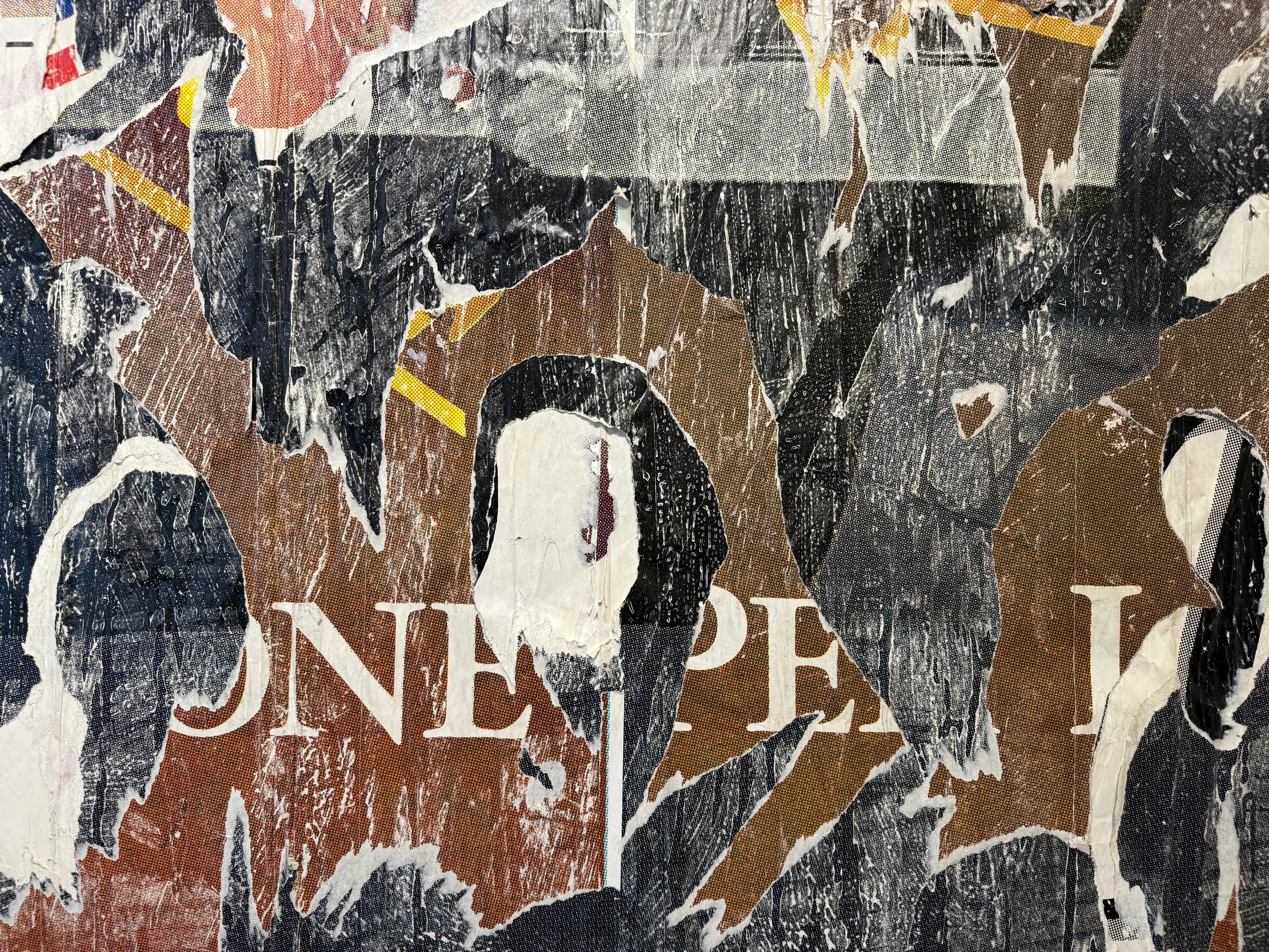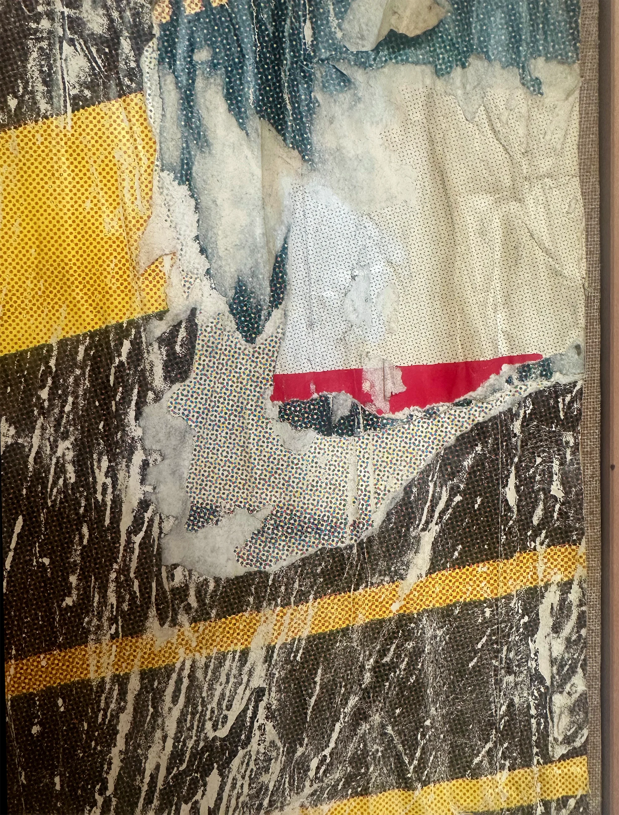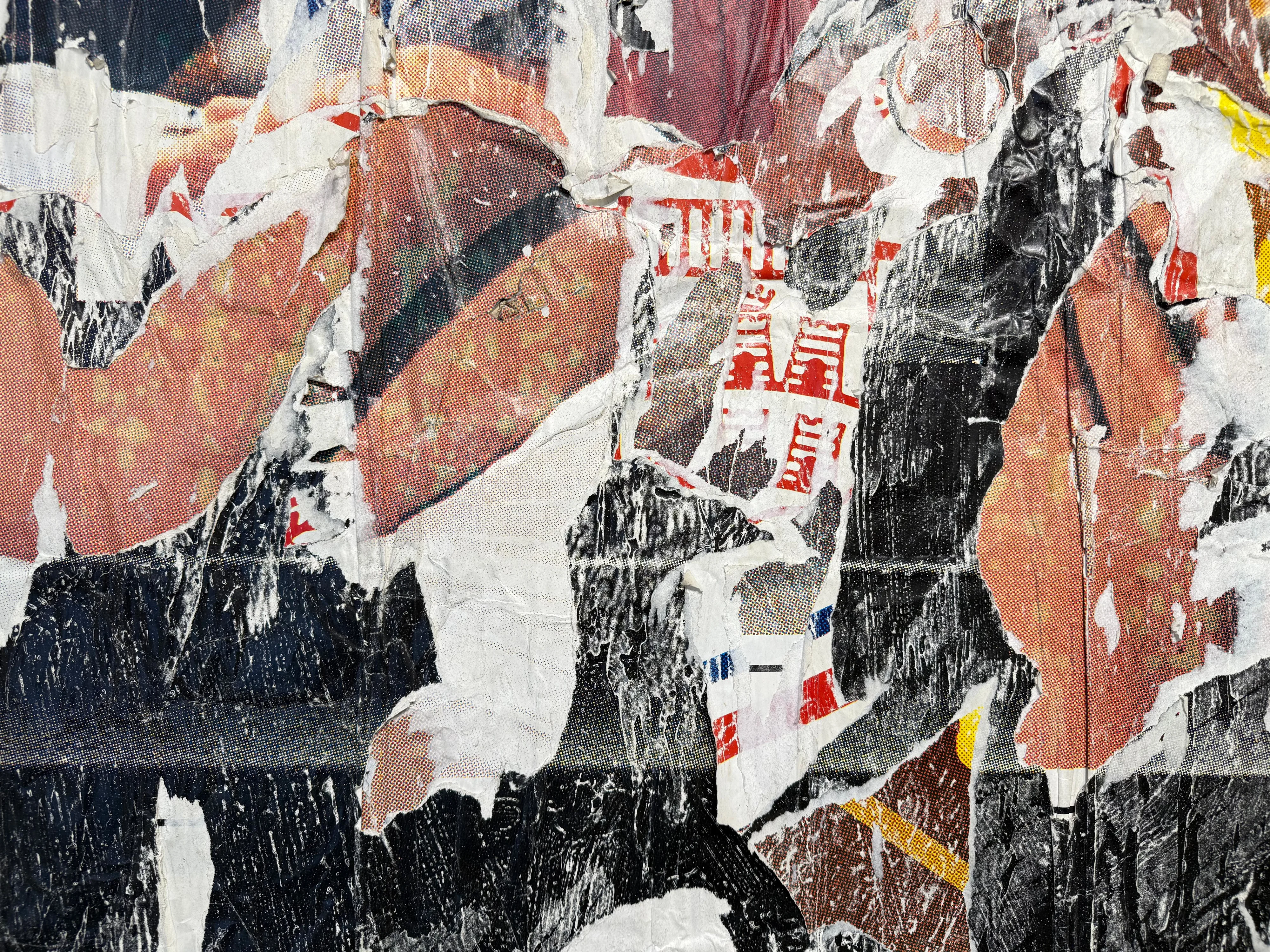 This decollage work appropriates and manipulates urban posters to construct a visual commentary on metropolitan life and social critique. By systematically tearing and reassembling found poster fragments, Rotella transforms commercial and public imagery into a vehicle for artistic protest against cultural stagnation. The layered composition reveals the archaeological strata of the city's visual environment, where successive advertisements create an unintended palimpsest of consumer and political messaging. Rather than employing the posters for aesthetic composition alone, the artist harnesses their symbolic and content value to articulate a position against societal complacency. The work exemplifies Decollage as a method of material subversion, where destruction and recombination become acts of creative resistance and reimagination.