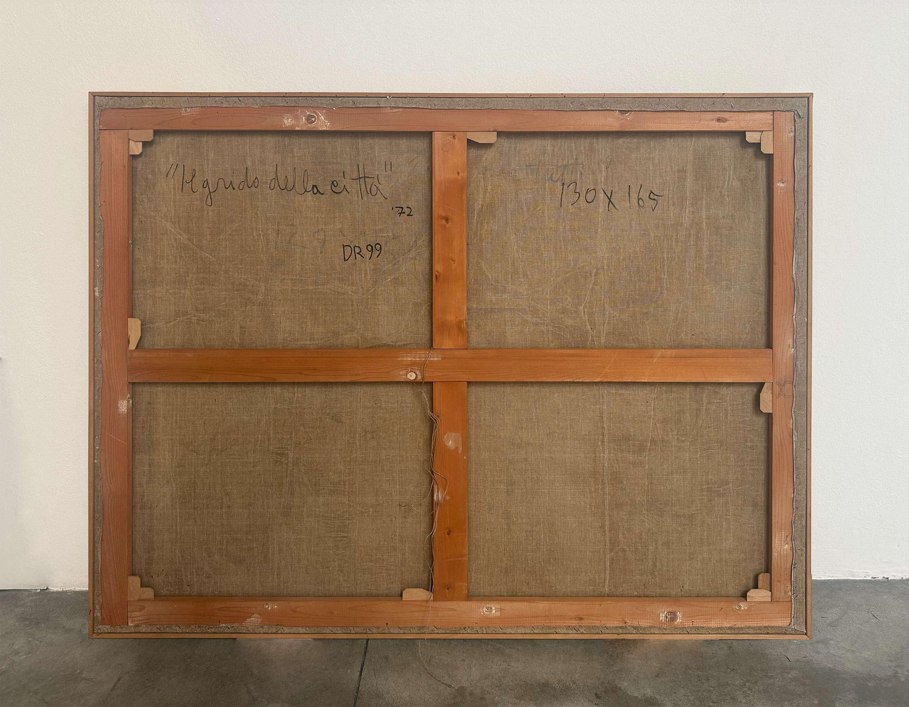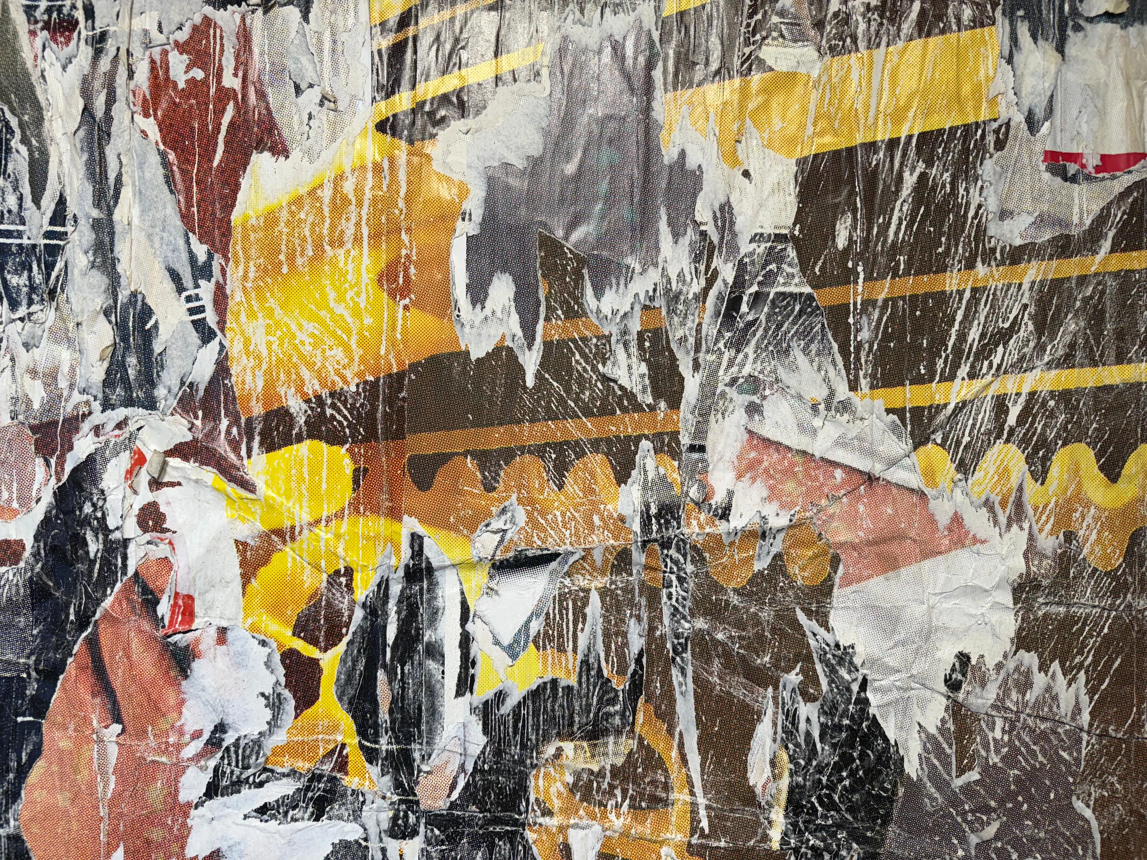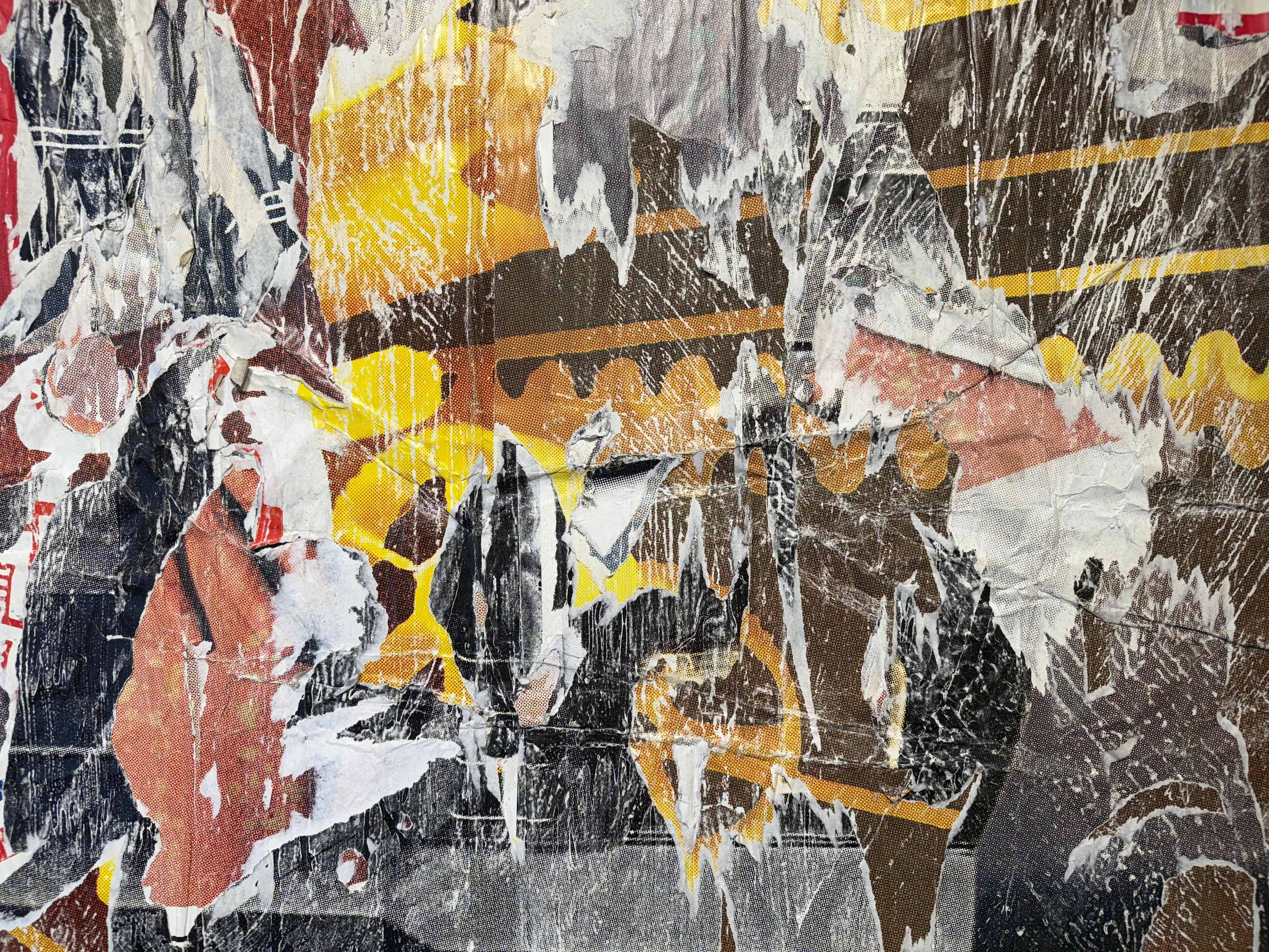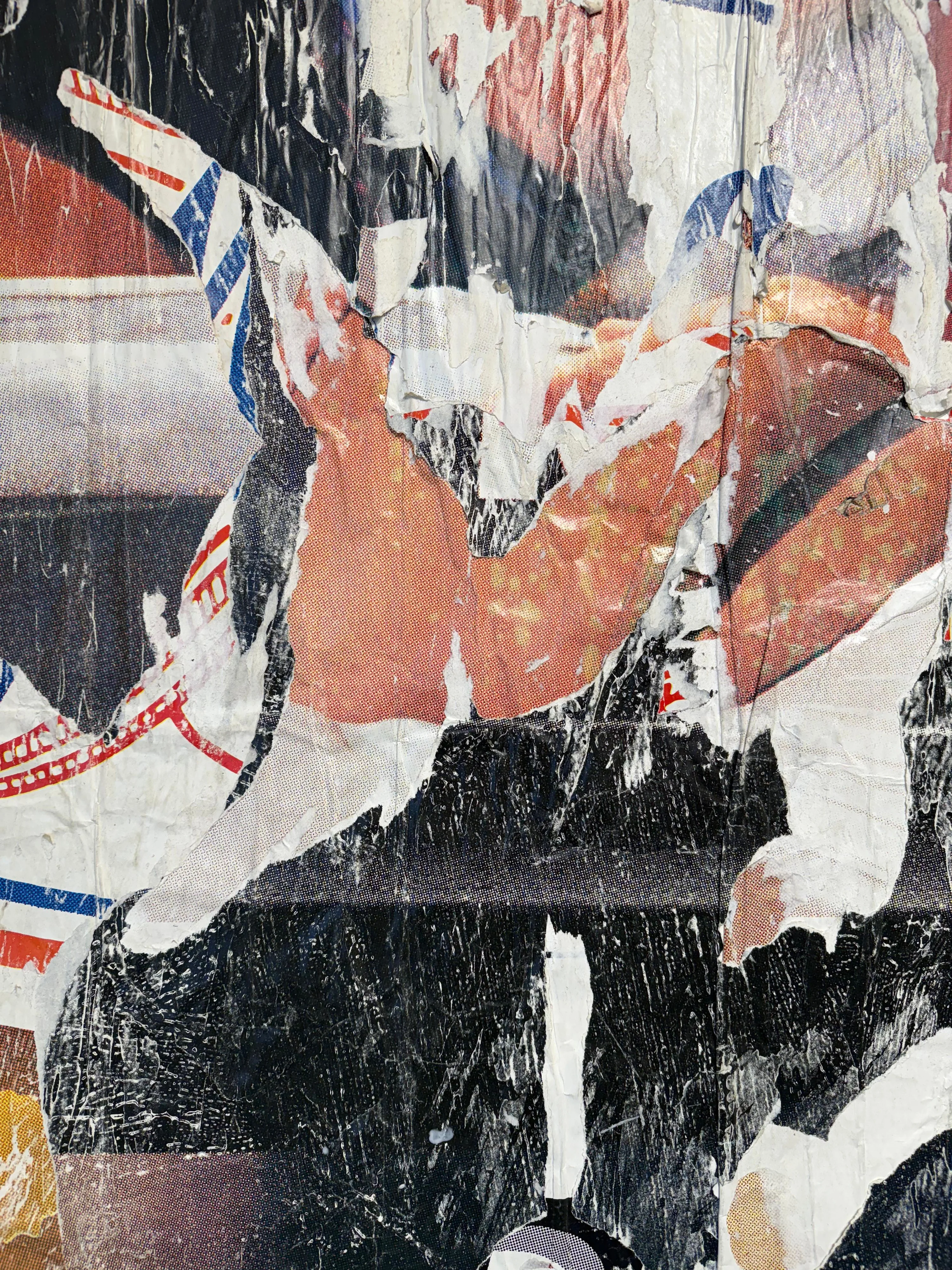 This decollage work appropriates and manipulates urban posters to construct a visual commentary on metropolitan life and social critique. By systematically tearing and reassembling found poster fragments, Rotella transforms commercial and public imagery into a vehicle for artistic protest against cultural stagnation. The layered composition reveals the archaeological strata of the city's visual environment, where successive advertisements create an unintended palimpsest of consumer and political messaging. Rather than employing the posters for aesthetic composition alone, the artist harnesses their symbolic and content value to articulate a position against societal complacency. The work exemplifies Decollage as a method of material subversion, where destruction and recombination become acts of creative resistance and reimagination.