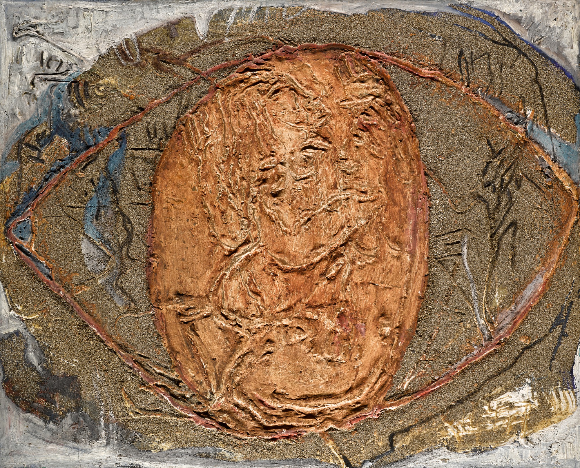 Mohan Samant's Composition (Orange Moon) is a mixed media work on canvas featuring warm tones and celestial imagery. The piece showcases the artist's exploration of color and form within the mixed media medium.