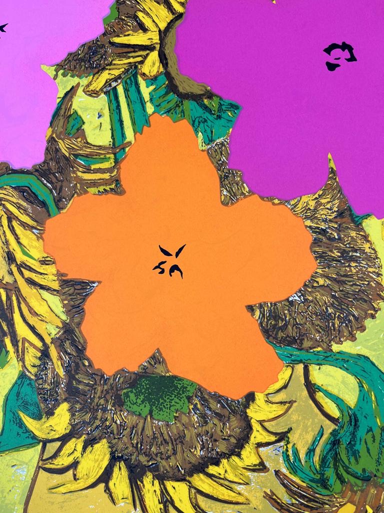 A vibrant pop art reinterpretation of Van Gogh's iconic Sunflowers, overlaid with Mr. Brainwash's signature bold Warhol-inspired flowers in pink, yellow, and orange. This 2023 screenprint combines street art immediacy with art historical homage, showcasing the artist's playful appropriation style. Part of a limited edition of 89, printed with deckled edges on museum-quality paper.
