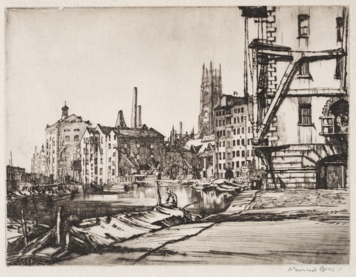Industrial architecture gains artistic dignity through Bone's precise drypoint work, exemplifying his pioneering role in finding beauty within Britain's commercial landscapes.