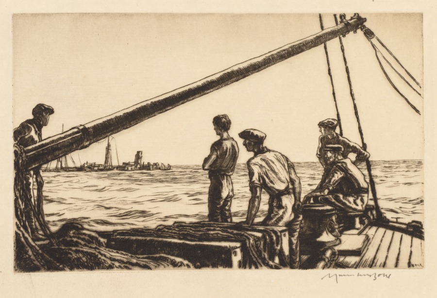 Among the most poignant of Bone's war prints, this drypoint captures the dangerous and heroic work of maritime rescue operations during the U-boat campaigns.