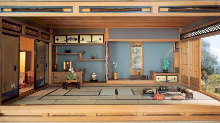 Contrasting Western room designs, this miniature interior celebrates Japanese aesthetic principles through tatami mats, sliding screens, and minimal furnishing arrangements.
