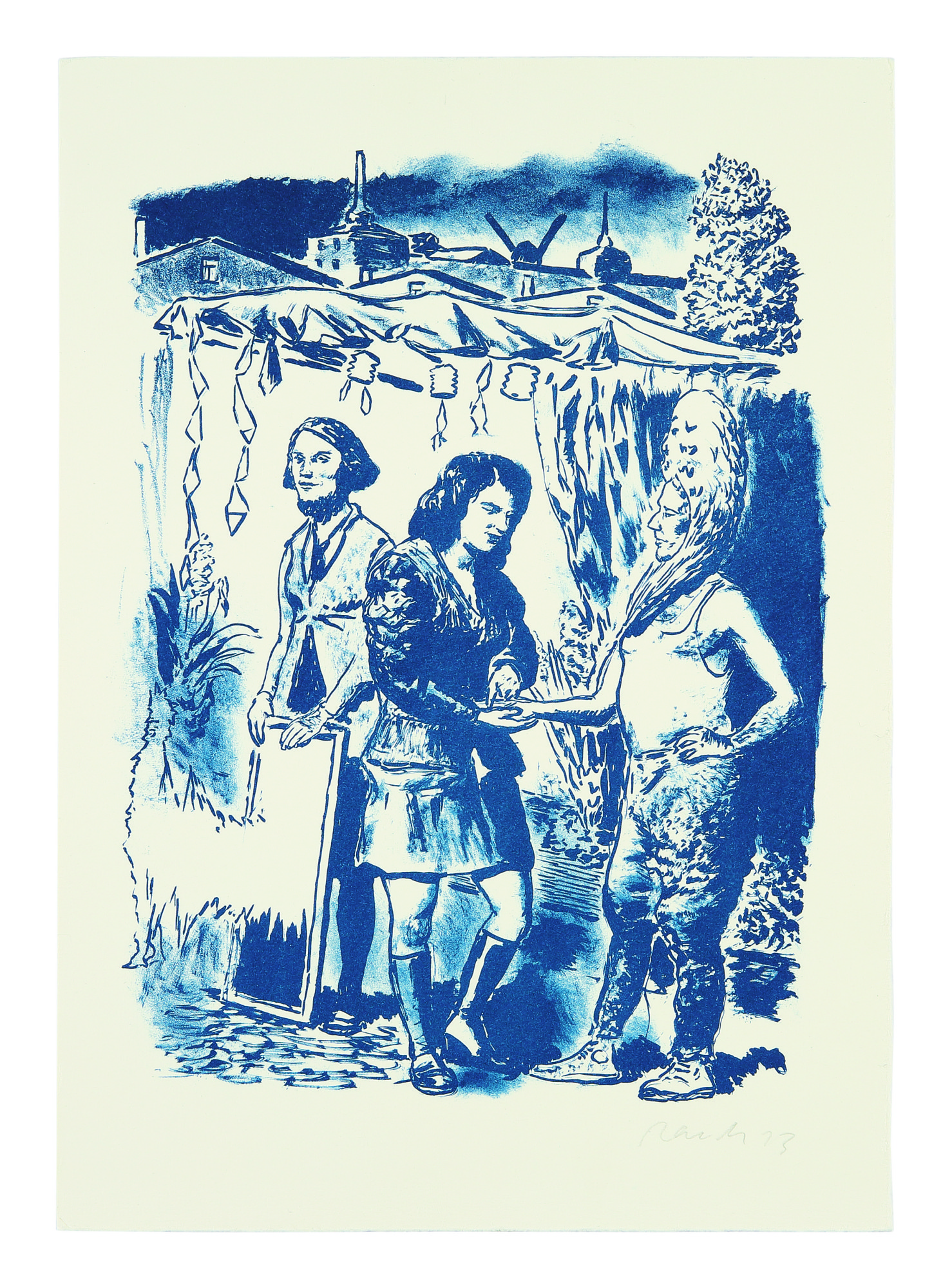 Neo Rauch's "New Year's Card" exemplifies his signature style of dreamlike, enigmatic imagery rooted in the traditions of Socialist Realism and Surrealism. The work presents ambiguous, theatrically posed figures inhabiting a mysterious, temporally dislocated world that blurs the boundaries between past and present, the familiar and the uncanny. Rauch's muted, carefully orchestrated palette and meticulous draftsmanship lend the composition an eerie stillness, inviting viewers into a narrative that remains perpetually elusive.