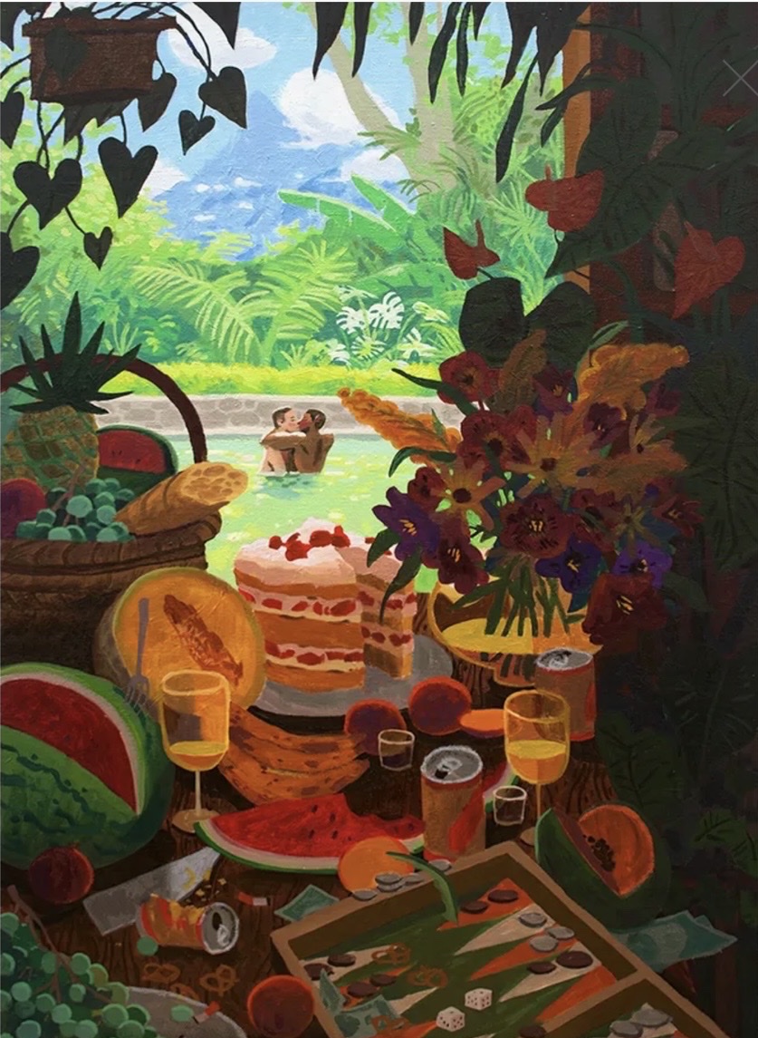 A vibrant tropical scene depicting a lush, idyllic paradise with couples in a turquoise pool surrounded by abundant fruit, flowers, and foliage. The composition presents a layered still life in the foreground featuring watermelon, cake, drinks, and playing cards, creating a festive atmosphere. Kennedy's rich color palette and playful perspective invite viewers into a dreamlike celebration of Caribbean leisure and abundance.