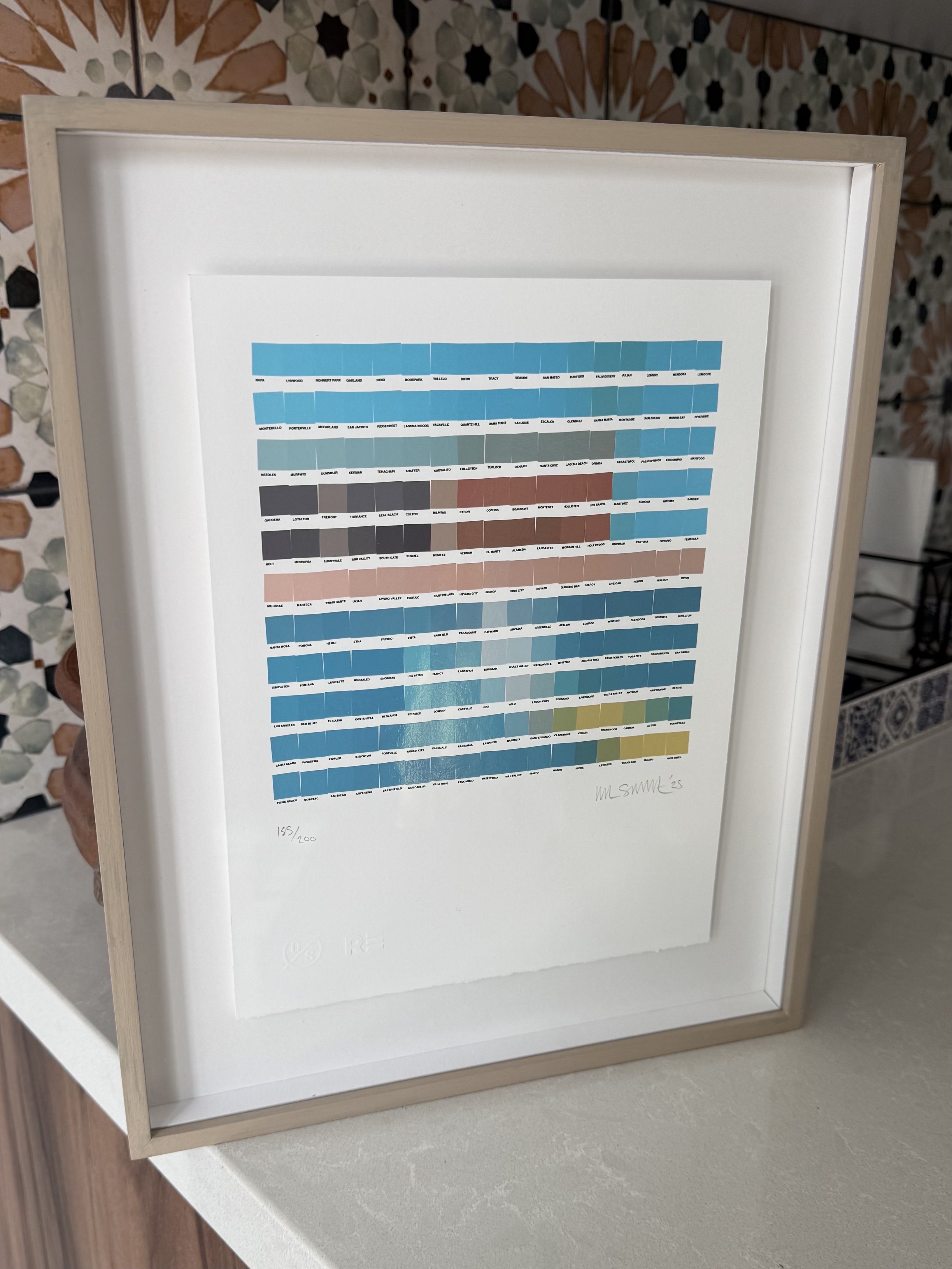This contemporary print by Nick Smith features a grid of color swatches creating a pixelated composition predominantly in shades of blue, with horizontal bands of browns, taupes, and grays. The work is numbered 195/400 and signed by the artist. Nick Smith is known for his distinctive style of recreating iconic images using color sample chips, blending Pop Art sensibilities with conceptual rigor.