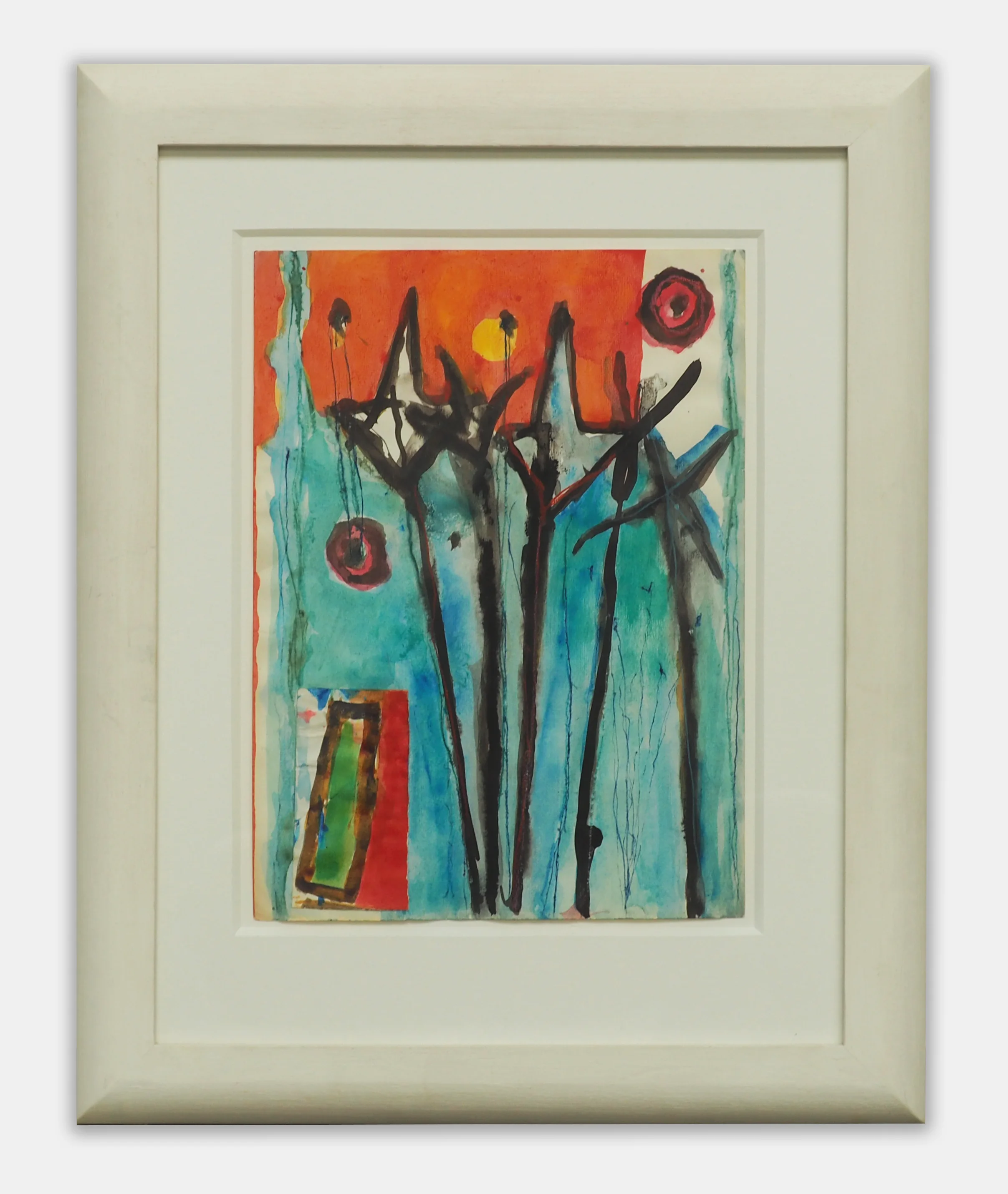 This mixed media work on paper bursts with vibrant color and playful gestural energy, reflecting the artist's deeply optimistic artistic philosophy. De Maria's approach merges lyrical abstraction with figurative elements, creating a fantasy landscape that stimulates emotional and imaginative response. The composition celebrates nature and vitality through bold, expressive mark-making and rich chromatic intensity. As a founding member of the Transavanguardia movement, De Maria championed an emotionally direct approach to abstraction that rejects conceptual austerity. The work invites viewers into a world where color itself becomes a vehicle for emotional vitality.