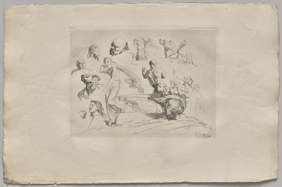 Multiple studies and preparatory drawings fill the etched surface, offering rare insight into the artist's creative process and demonstrating the spontaneous quality achievable through direct work on copper.