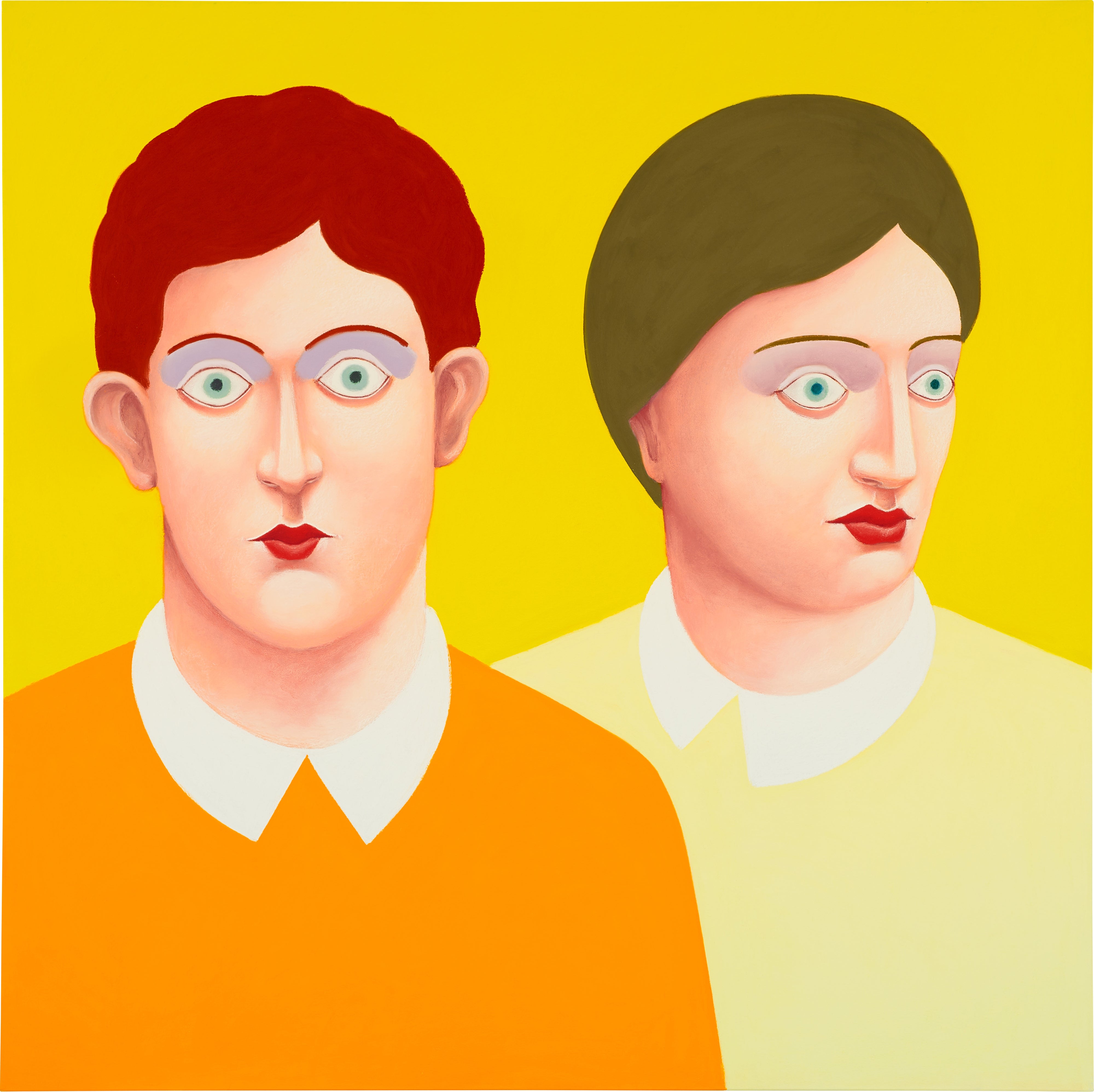 Two Portraits is a striking pastel on linen work by Swiss artist Nicolas Party, created in 2016. The piece showcases Party's signature style, combining bold, flat fields of color with a dreamlike, otherworldly quality reminiscent of classical portraiture filtered through a modern, surrealist lens. His masterful use of pastel on linen lends the work a rich, velvety texture that enhances the mysterious and contemplative mood of the paired figures.