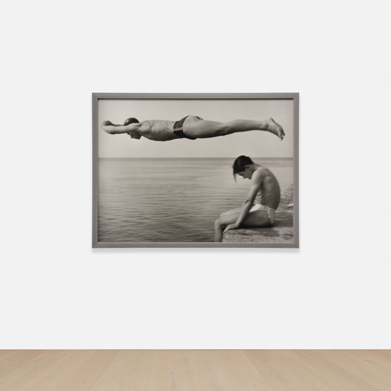 This iconic photograph captures a moment of dynamic action set against quiet contemplation along the Italian coast. A male figure is frozen in a perfect horizontal dive above the water, his athletic body fully extended, while below him another young man sits pensively on a rocky pier. The powerful contrast between movement and stillness is rendered with exceptional tonal depth and compositional mastery. A celebrated example of postwar Italian photography, this work exemplifies Migliori's gift for transforming fleeting moments into enduring poetic images.