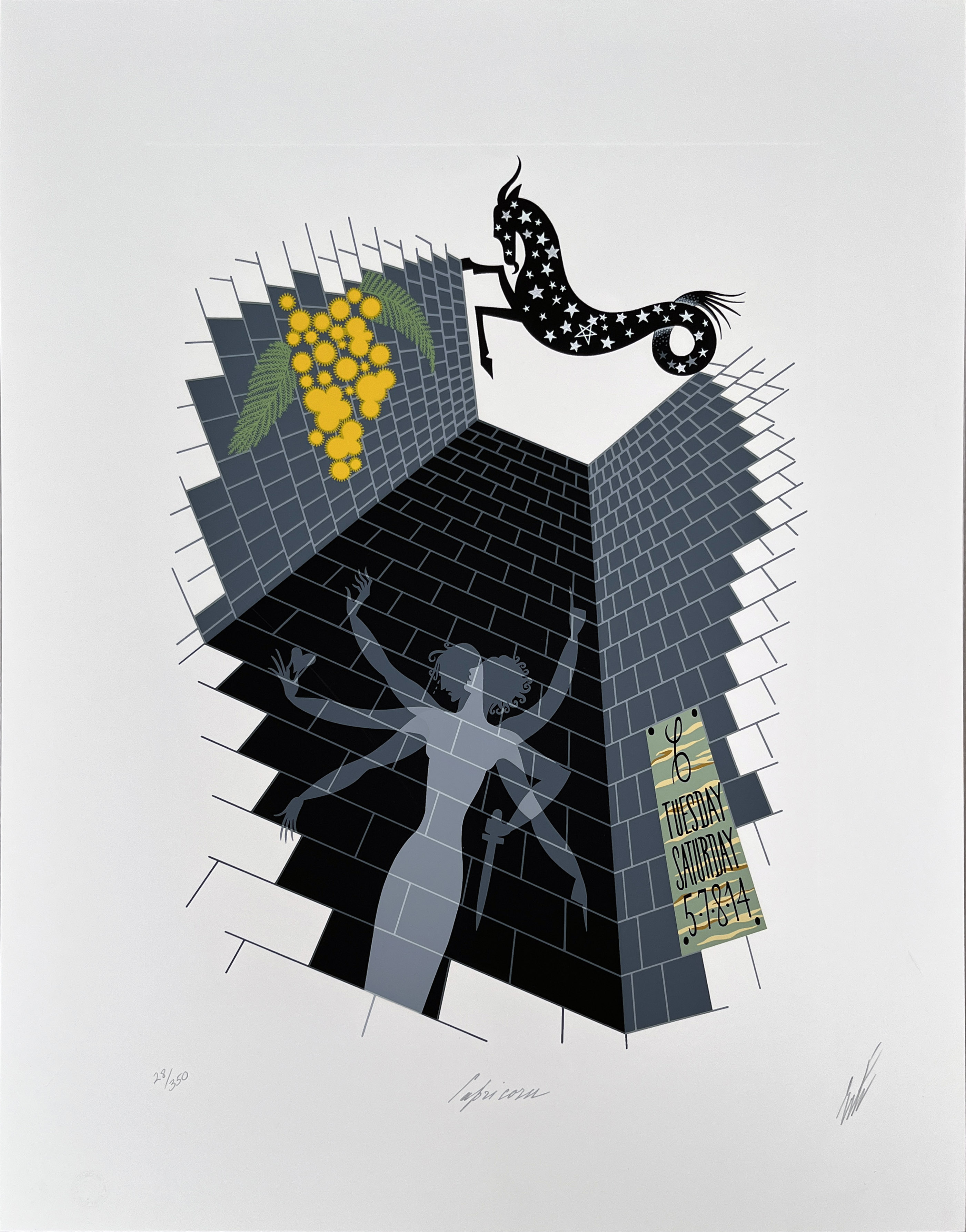 This 1982 hand-signed serigraph exemplifies Erté's mastery of the zodiac series, featuring his signature Art Deco aesthetic with flowing linear forms and rich chromatic contrasts. The work demonstrates the artist's skillful translation of his theatrical costume design sensibilities into the serigraph medium, capturing Capricorn's symbolic essence through elegant geometric stylization.