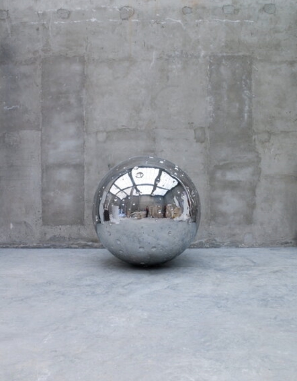 Moon is a large polished stainless steel sphere by Swiss artist Not Vital, created in 2010 and measuring 180 cm in diameter. The highly reflective surface captures and distorts the surrounding environment, creating an immersive optical experience that shifts with every vantage point. The lower hemisphere features subtle cratered texturing evoking the lunar surface, contrasting beautifully with the mirror finish above. This is a unique work accompanied by a Certificate of Authenticity issued by the gallery.