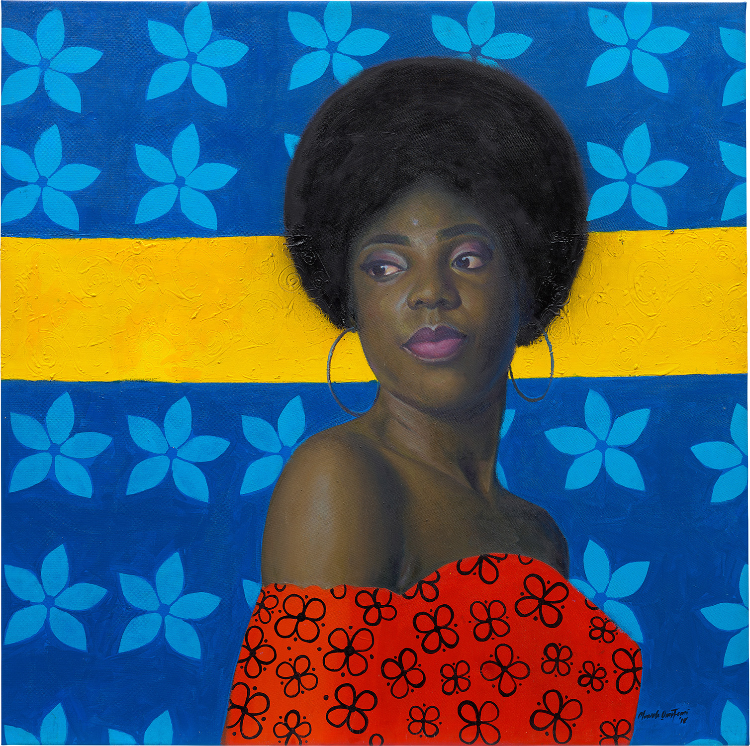 Oluwole Omofemi's 2018 painting combines oil and acrylic on canvas to create a work titled 'Omodunni,' which may reference Yoruba cultural or linguistic elements.