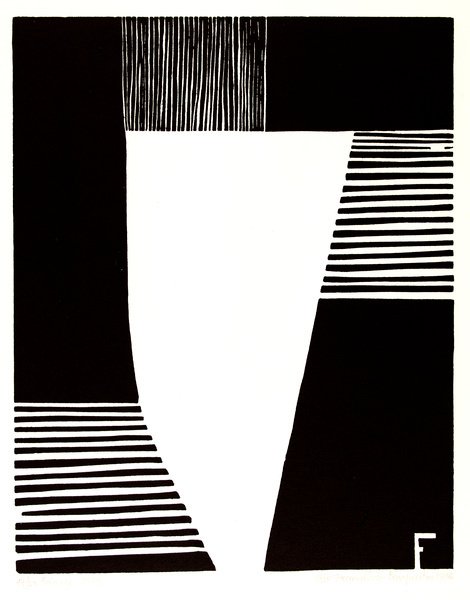 Geometric shapes interlock in balanced harmony, exemplifying the artist's sophisticated approach to non-representational composition in printmaking.