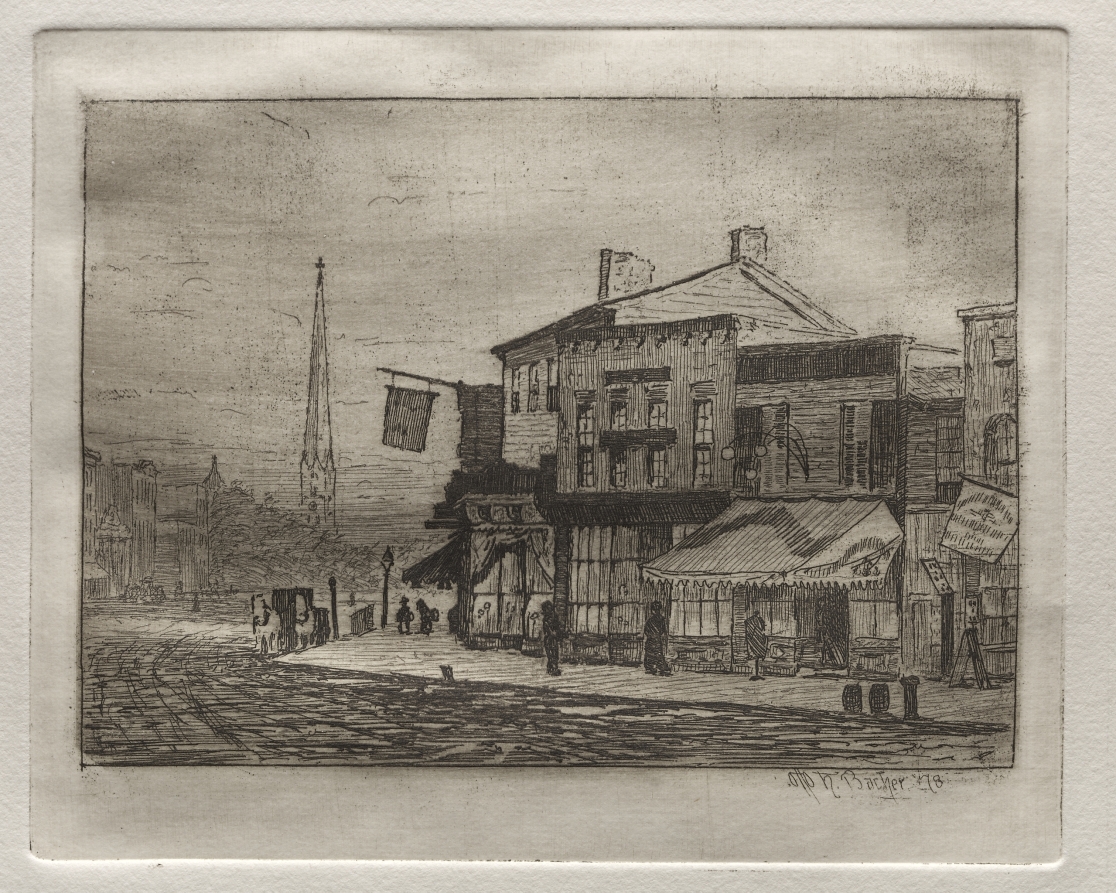 Documentary precision meets artistic vision in this urban scene, preserving a specific Cleveland intersection while demonstrating Bacher's skill in architectural rendering.