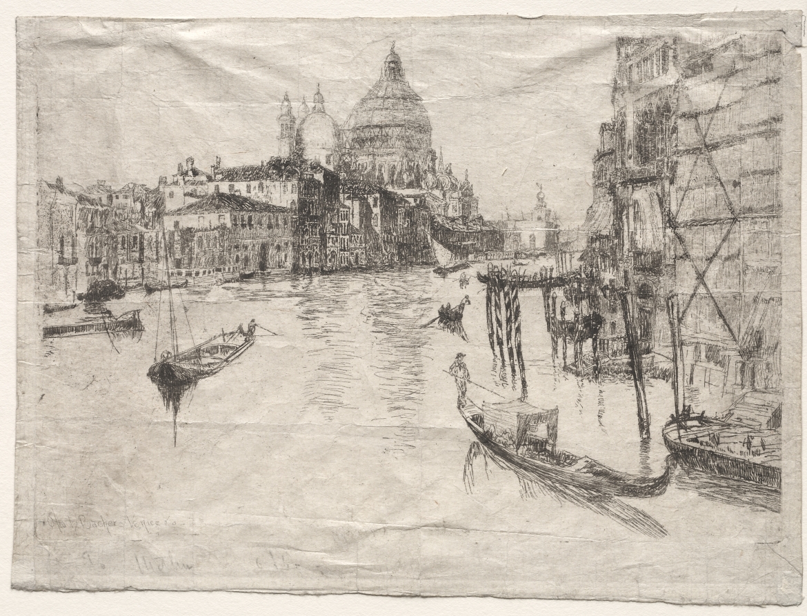 Featuring Venice's most famous waterway vista, the work represents Bacher's contribution to the American artist colony that flocked to capture Venetian light and atmosphere.