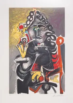 This 1968 colored lithograph by Pablo Picasso depicts a musketeer figure smoking a pipe, rendered in the artist's characteristic Cubist style that fragments and recombines forms to create dynamic visual complexity. Created late in Picasso's career, the work was professionally printed by the renowned Parisian workshop Mourlot and published as part of a limited edition of 300, reflecting the artist's continued engagement with printmaking as a primary medium for artistic expression. The composition exemplifies Picasso's enduring fascination with the musketeer subject and his ability to synthesize classical figuration with modernist abstraction through the lithographic process.