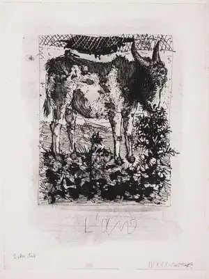 Picasso's "L'Ane" is a finely executed etching with aquatint and drypoint from 1936, created as an illustration for Buffon's Histoire Naturelle. This second state proof, printed before the plate was steel faced and beveled, demonstrates Picasso's mastery of intaglio techniques through its subtle tonal variations and precise linear work. The print exemplifies Picasso's ability to capture animal subjects with both naturalistic detail and expressive character, rendered on high quality Montval wove paper with generous margins.