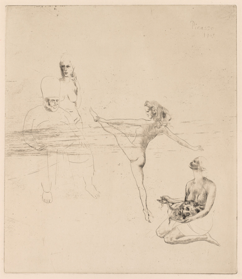 Biblical drama unfolds through Picasso's distinctive linear style, combining etching and drypoint techniques to create rich textural contrasts in this Rose Period work.