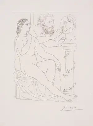 Picasso's etching from La Suite Vollard depicts the classical theme of a sculptor contemplating his own creation, exploring the relationship between artist, muse, and artwork through his characteristic linear style. Created in 1933, this print exemplifies the series' sophisticated examination of the creative process and artistic identity. The work remains a significant example of printmaking from Picasso's mature period, rendered with the technical precision and psychological depth that defined the ambitious Vollard portfolio.