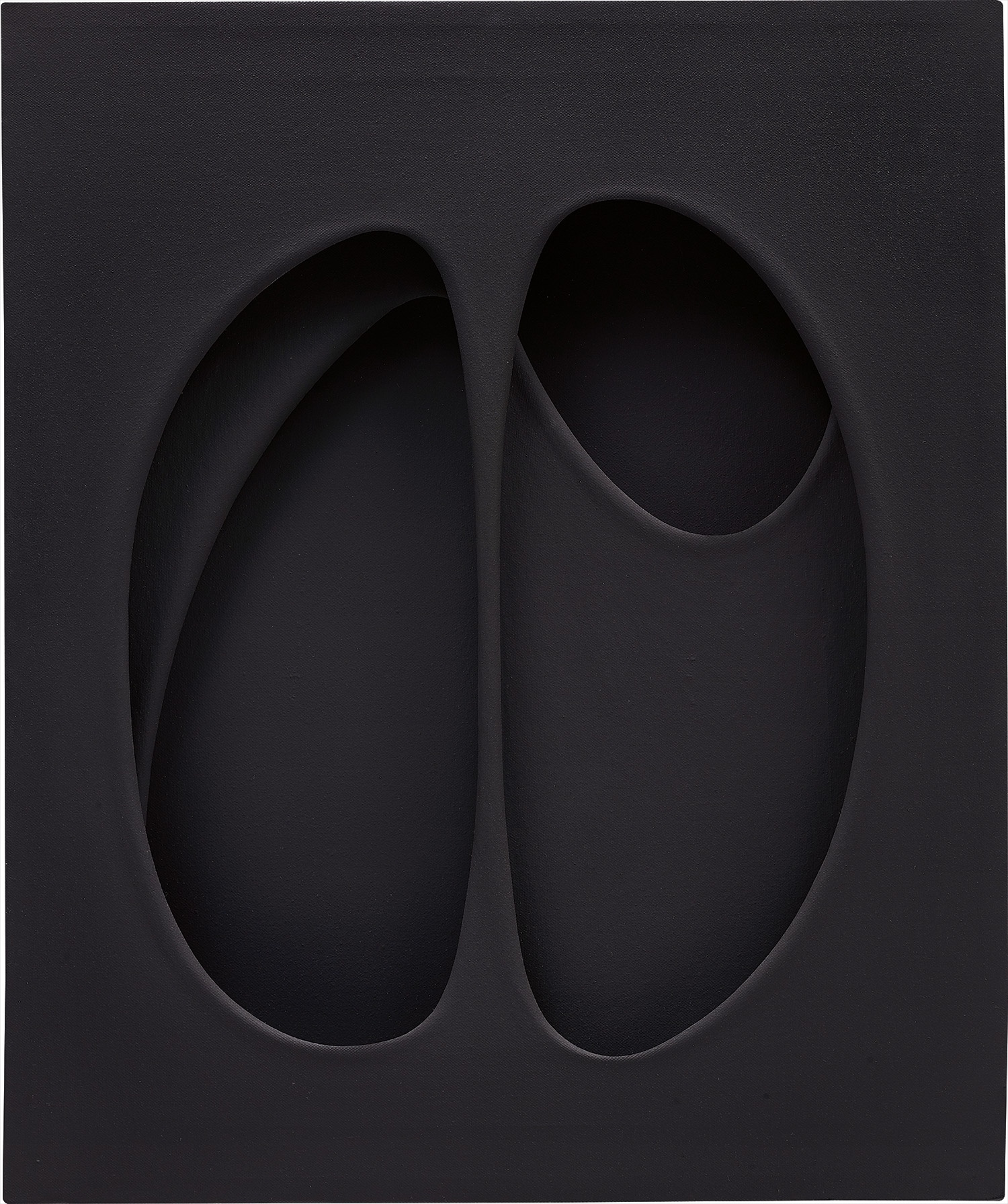 Paolo Scheggi's 1963 work 'Per una situazione' employs black acrylic across three superimposed canvases, exploring spatial relationships and layering. This experimental approach demonstrates Scheggi's innovative engagement with the materiality of painting itself.