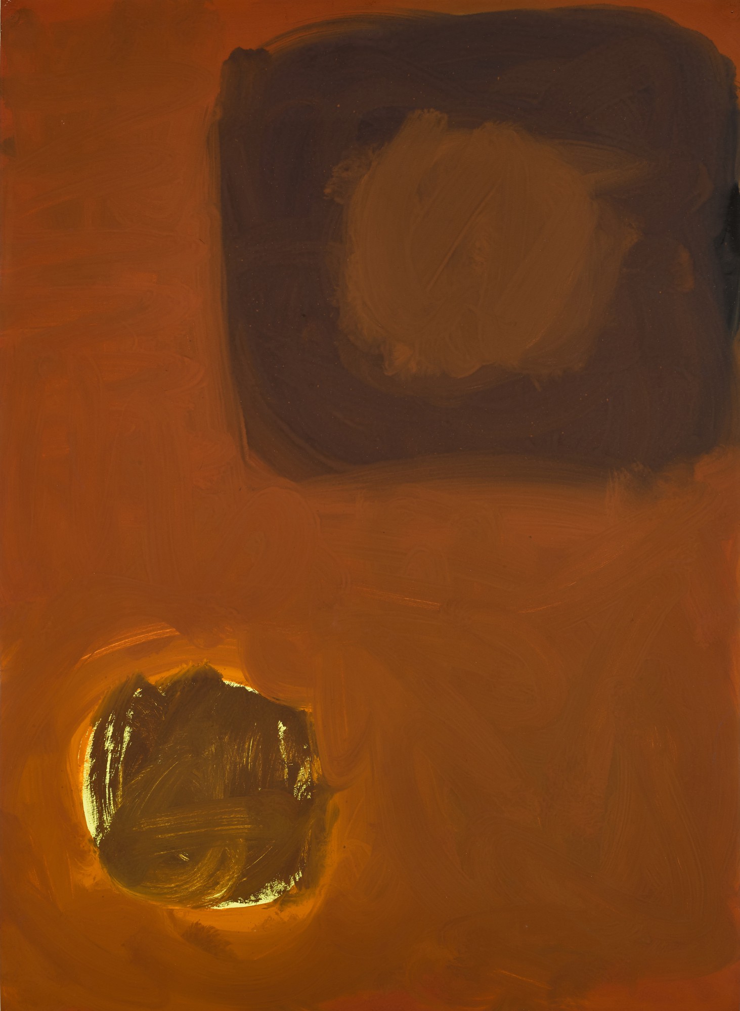 A gouache painting on paper by Patrick Heron from 1961, featuring rich color relationships between cinnamon and dirty violet tones. The work exemplifies Heron's abstract approach to color composition.
