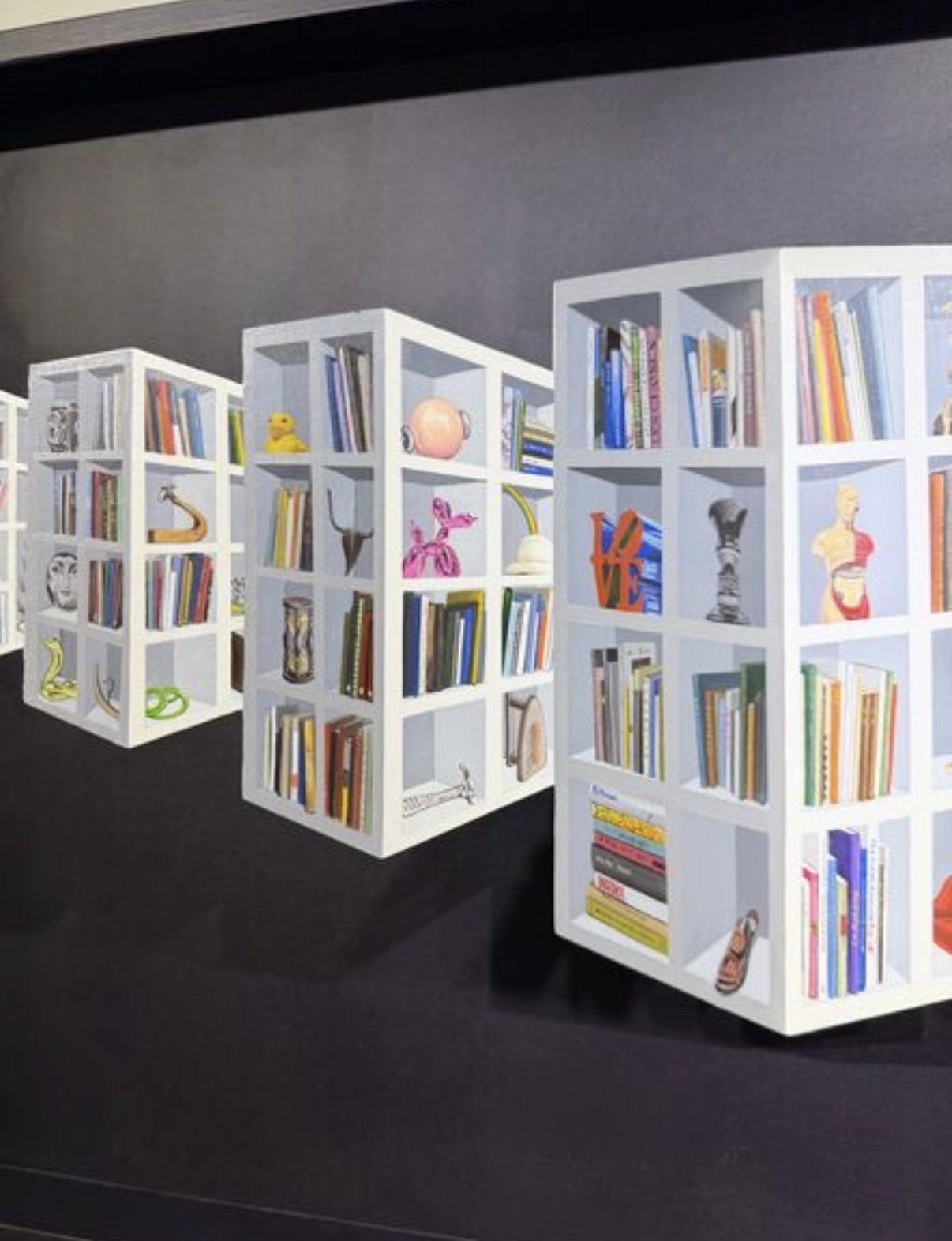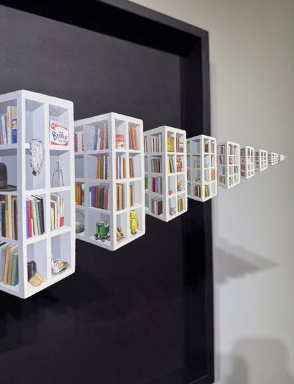 A striking reverspective construction by British artist Patrick Hughes, depicting an infinite procession of white bookshelves receding symmetrically to either side, each shelf populated with colorful books, sculptural objects, and curios. The central bookcase dominates the composition, creating a powerful three-dimensional optical illusion that appears to move as the viewer shifts perspective. Framed in a deep black float frame and presented as a unique work, this piece exemplifies Hughes's signature reverspective technique, merging painting and sculpture into a single mind-bending object. Hand-signed on the verso by the artist.
