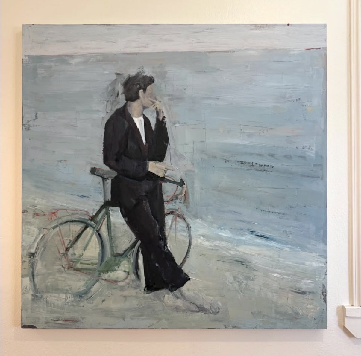 A contemplative figurative painting depicting a person in a black suit seated on a bicycle beside a body of water. The composition features loose, gestural brushwork with a muted palette of grays, blues, and whites that creates an atmospheric, dreamlike quality. The figure's pose and the coastal setting evoke themes of solitude and reflection, rendered with painterly sensitivity and emotional depth.