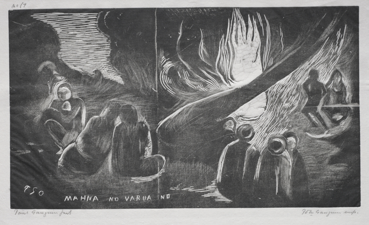 Bold, expressive woodcut technique transforms Tahitian mythology into a haunting visual narrative, exemplifying Gauguin's primitivist approach to non-Western spiritual themes.