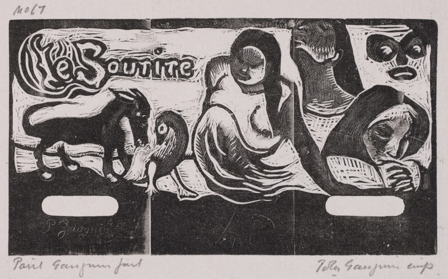 Representative of Gauguin's mature Tahitian period, this woodcut demonstrates his mastery of the medium's expressive possibilities and his romanticized vision of Polynesian life.