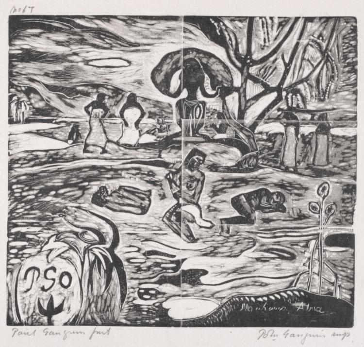 Raw woodcut marks and flattened forms reflect Gauguin's rejection of Western artistic traditions in favor of what he perceived as more authentic, primitive expression.