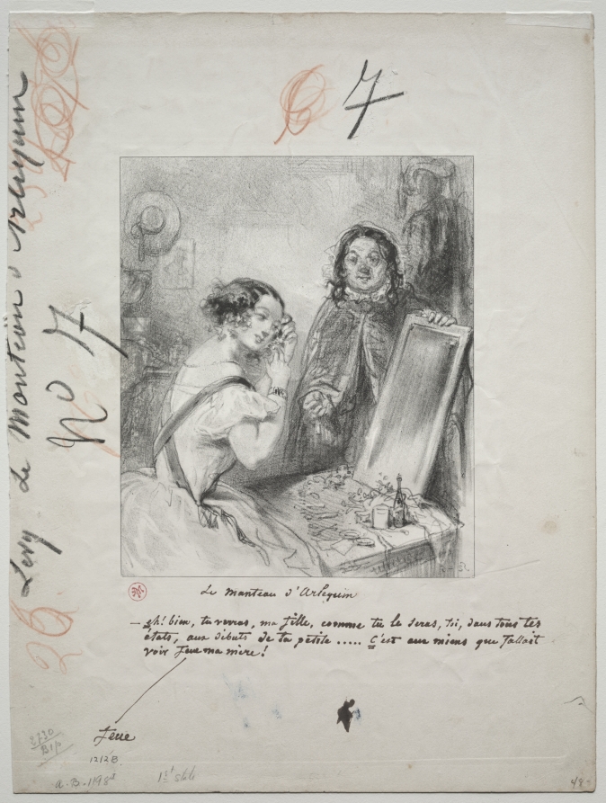 From the theatrical "Manteau d'Arlequin" series, showcasing Gavarni's fascination with performance and masquerade as metaphors for social pretense.