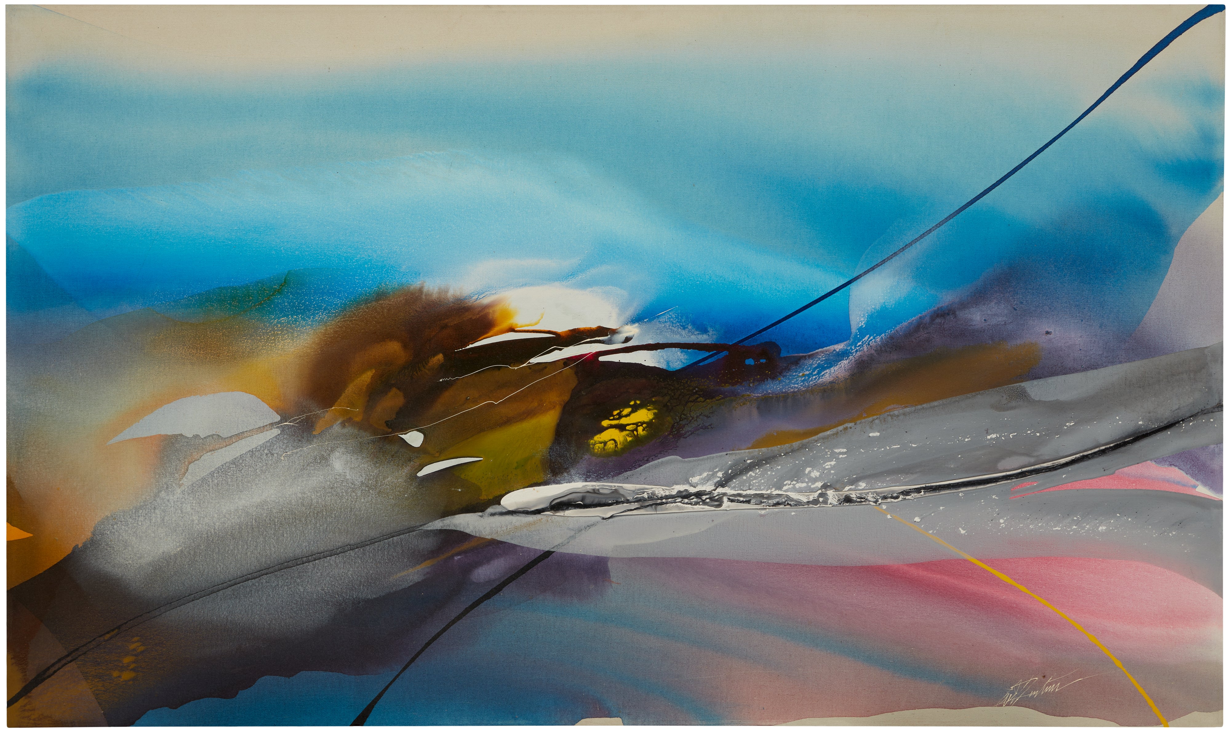 Paul Jenkins's *Phenomena Lure of Blue* (1970) is a luminous acrylic on canvas that showcases the artist's signature technique of pouring and guiding fluid paint across the surface, creating sweeping veils of deep, translucent blues that seem to shift and breathe. The composition evokes a sense of cosmic depth and natural phenomena, as layers of color bleed and flow into one another with organic spontaneity. Jenkins's masterful manipulation of the medium results in a work that balances chance and control, drawing the viewer into an almost meditative exploration of color and movement.