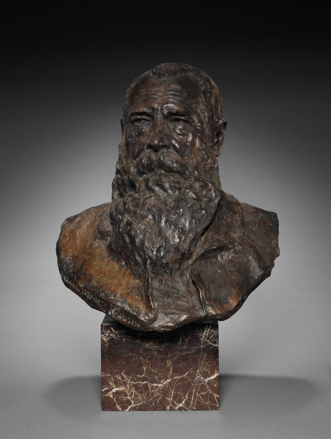 Despite the 1800 date, this bronze portrait likely represents a later tribute to the Impressionist master, combining classical sculptural tradition with marble presentation.