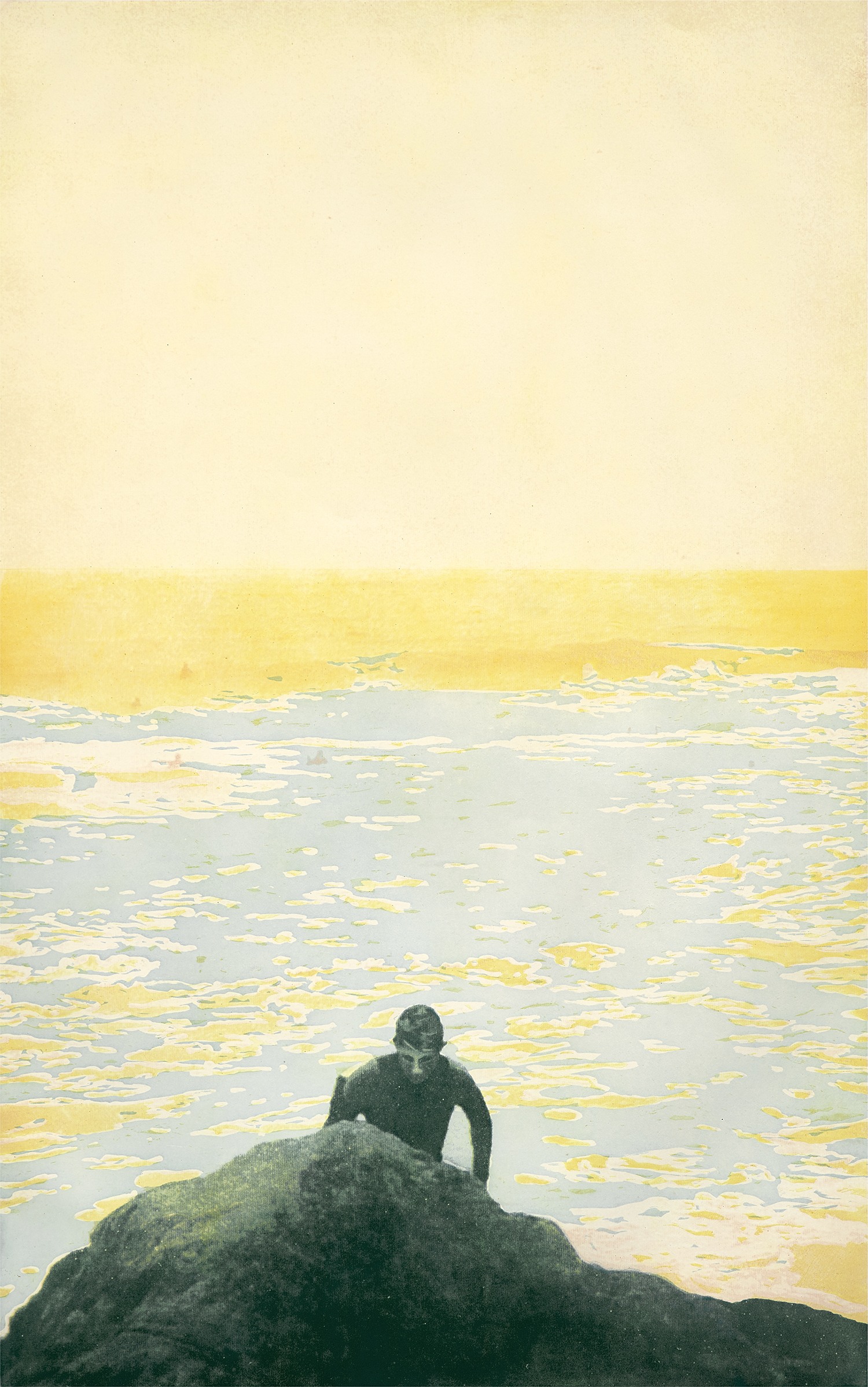 An etching and aquatint depicting a surfer, rendered in vibrant colors with expressive mark-making. The work captures movement and energy through the combination of printmaking techniques.