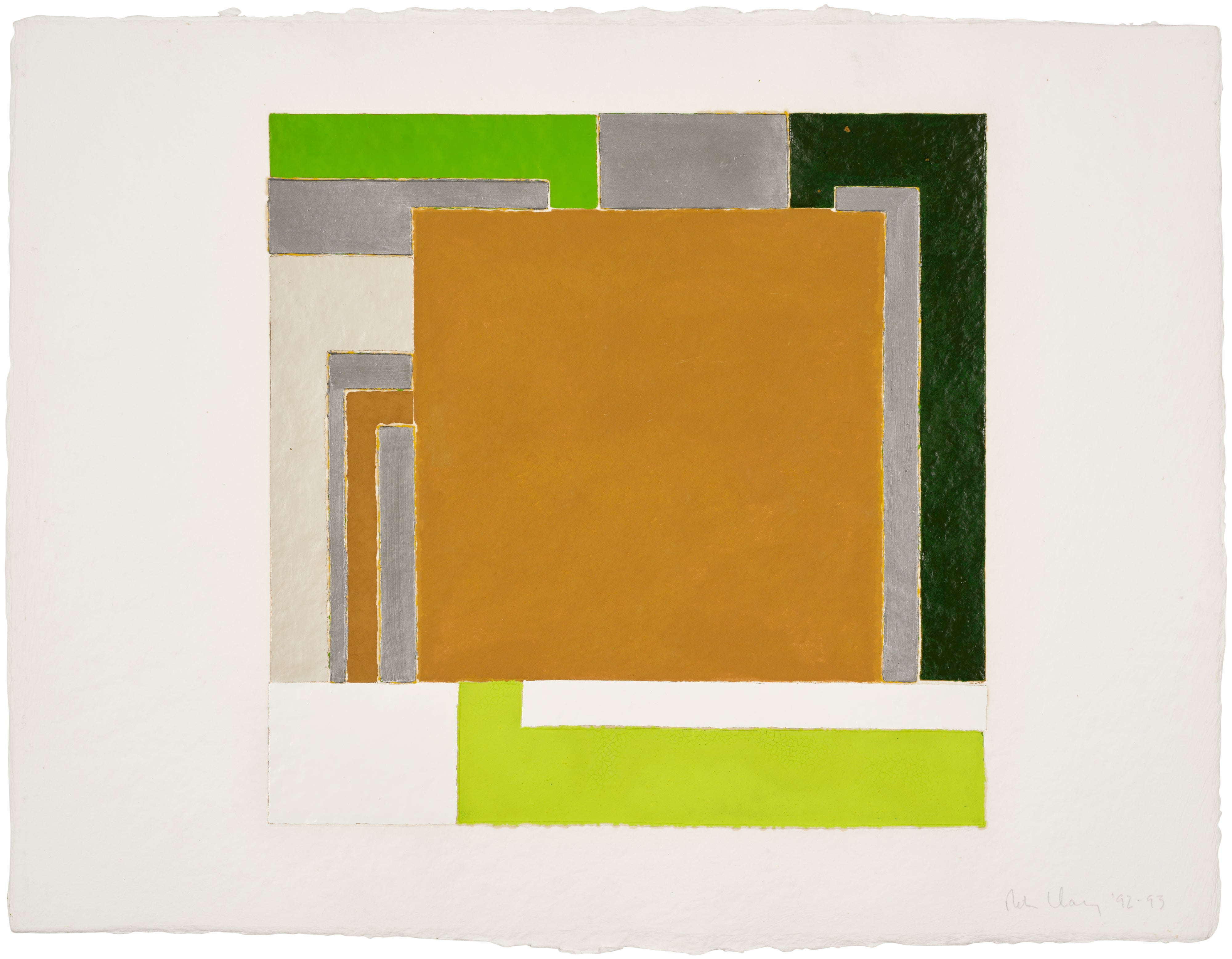 A work by Peter Halley dated 1992-93, representing the artist's exploration of neon color fields and digital-age aesthetics. The framed piece is signed and dated in pencil.