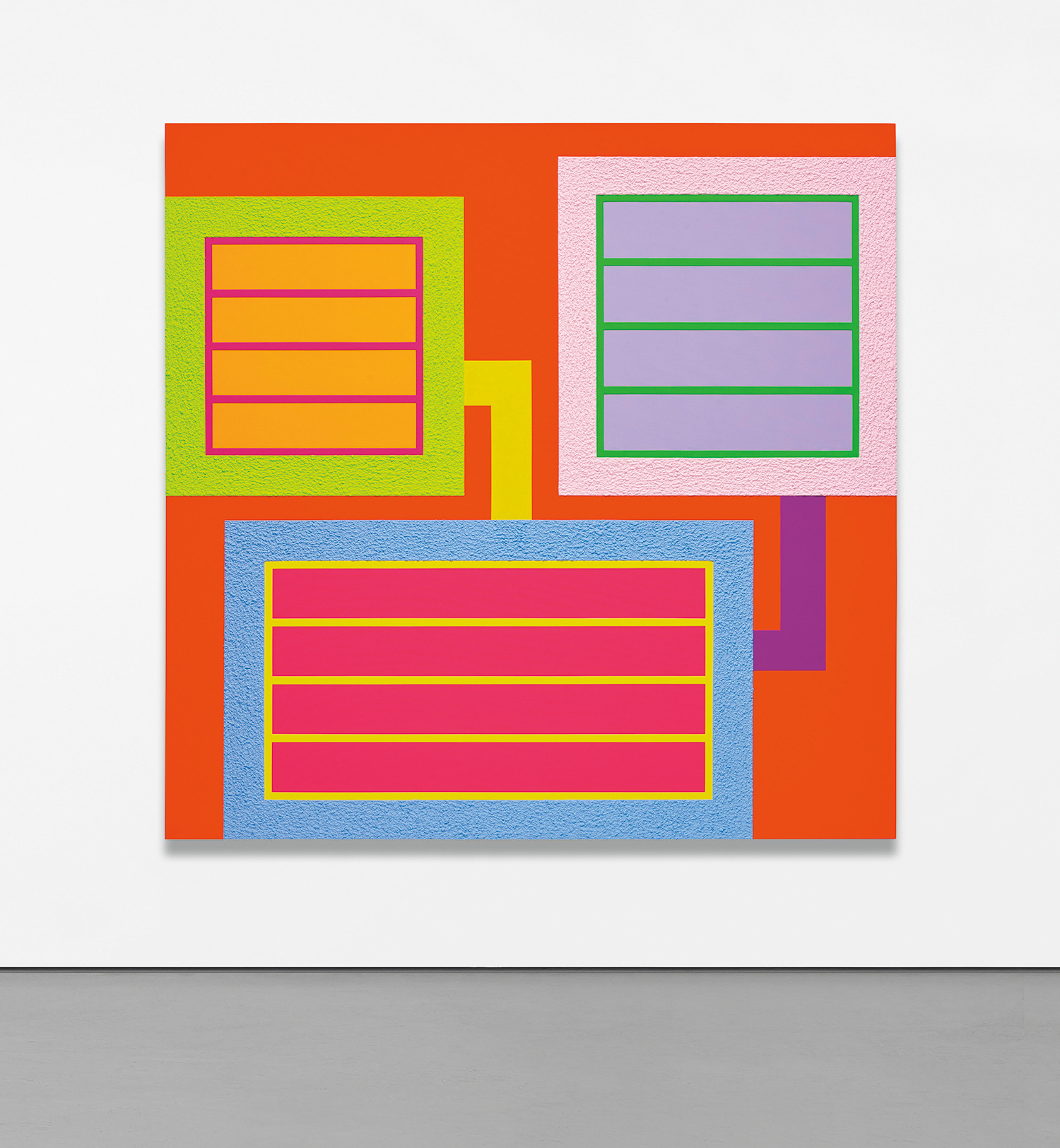 Peter Halley's Bright from 2018 is a vibrant acrylic painting combining fluorescent acrylic and textured Roll-a-Tex on canvas. The work employs contemporary materials and luminous color to create an energetic, optically engaging composition.