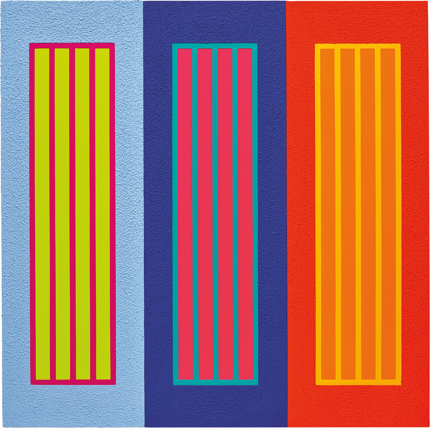 - acrylic, DayGlo acrylic and Roll-A-Tex on canvas, in 3 parts
