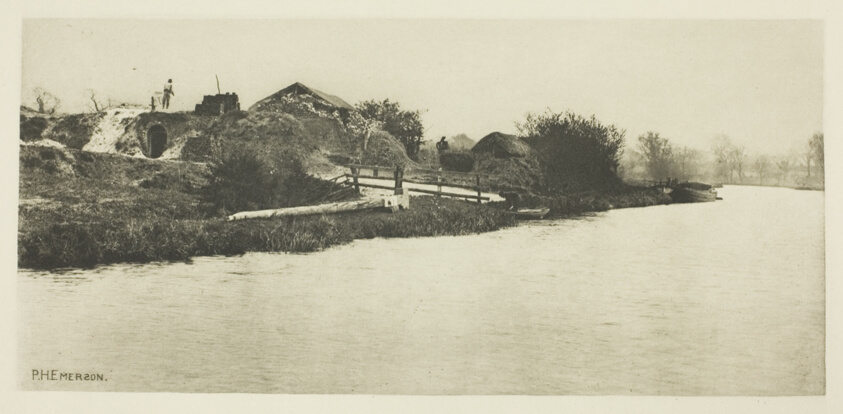 Industrial brick-making operations along the Norfolk Broads reveal Emerson's interest in documenting both traditional crafts and emerging industries. The photogravure process perfectly captures the interplay of smoke, water, and human activity in this riverside scene.