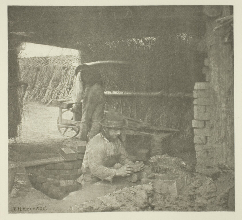 Workers shape clay into bricks in a scene that captures both traditional craftsmanship and the growing industrialization of rural Norfolk. Emerson's respectful portrayal of manual labor helped elevate working-class subjects in fine art photography.