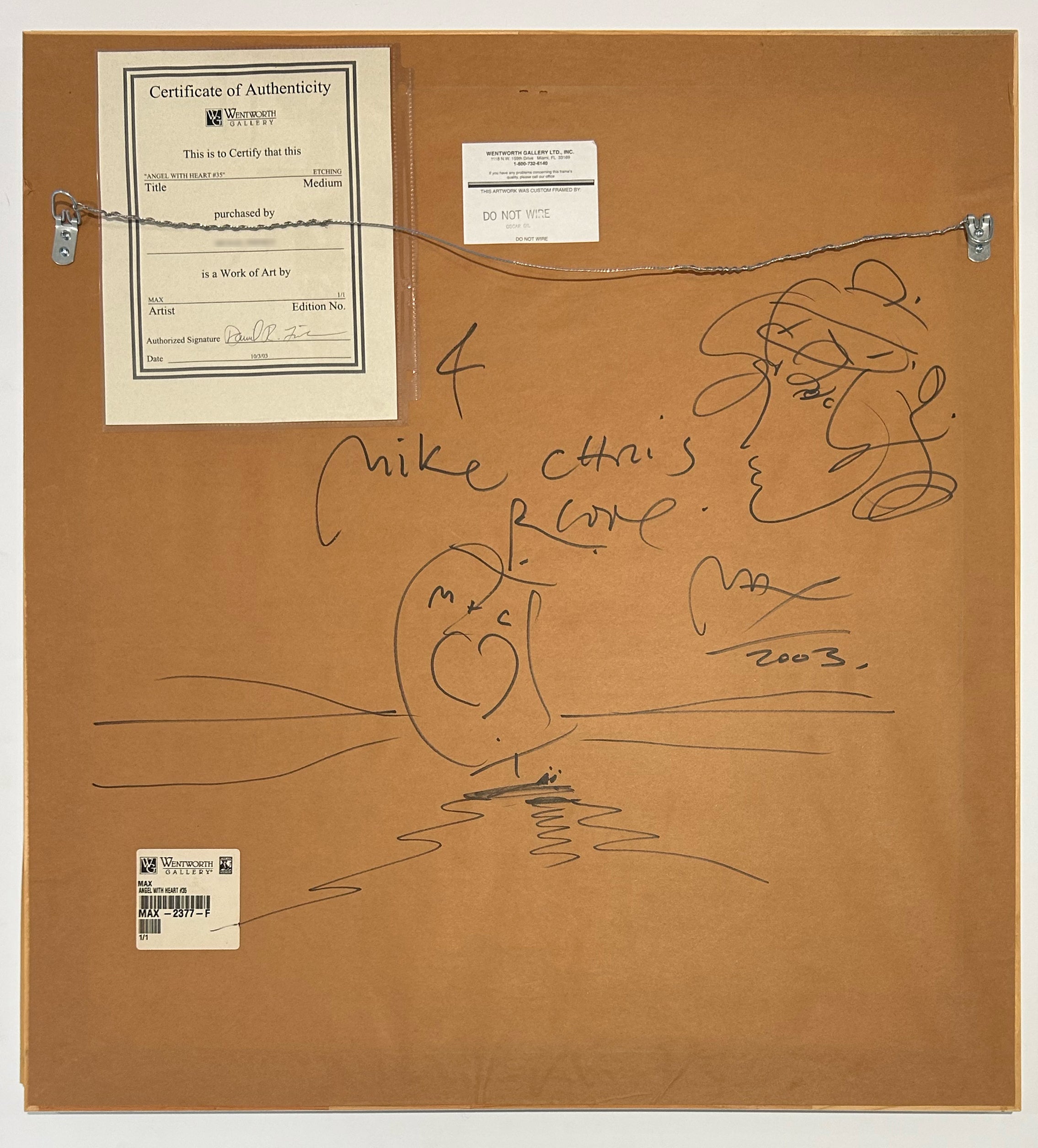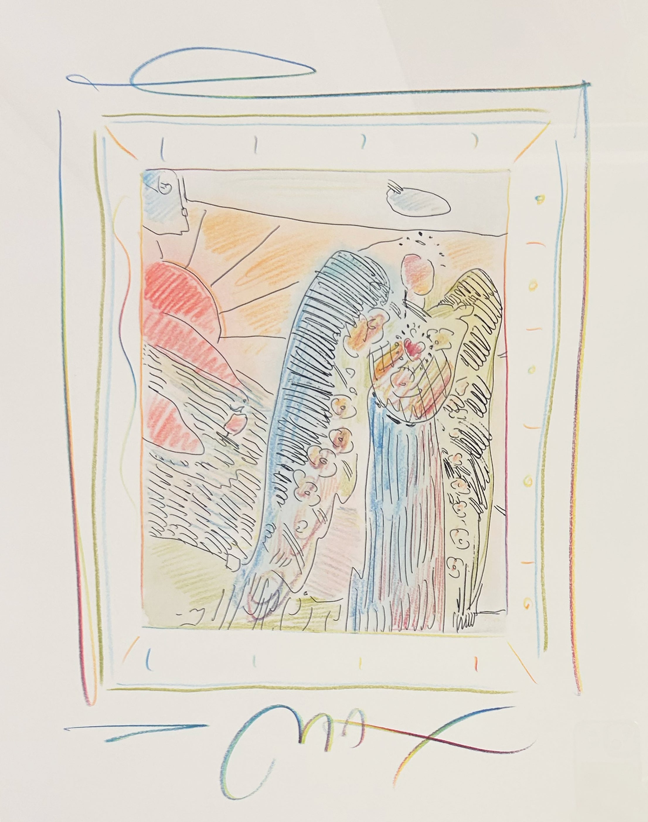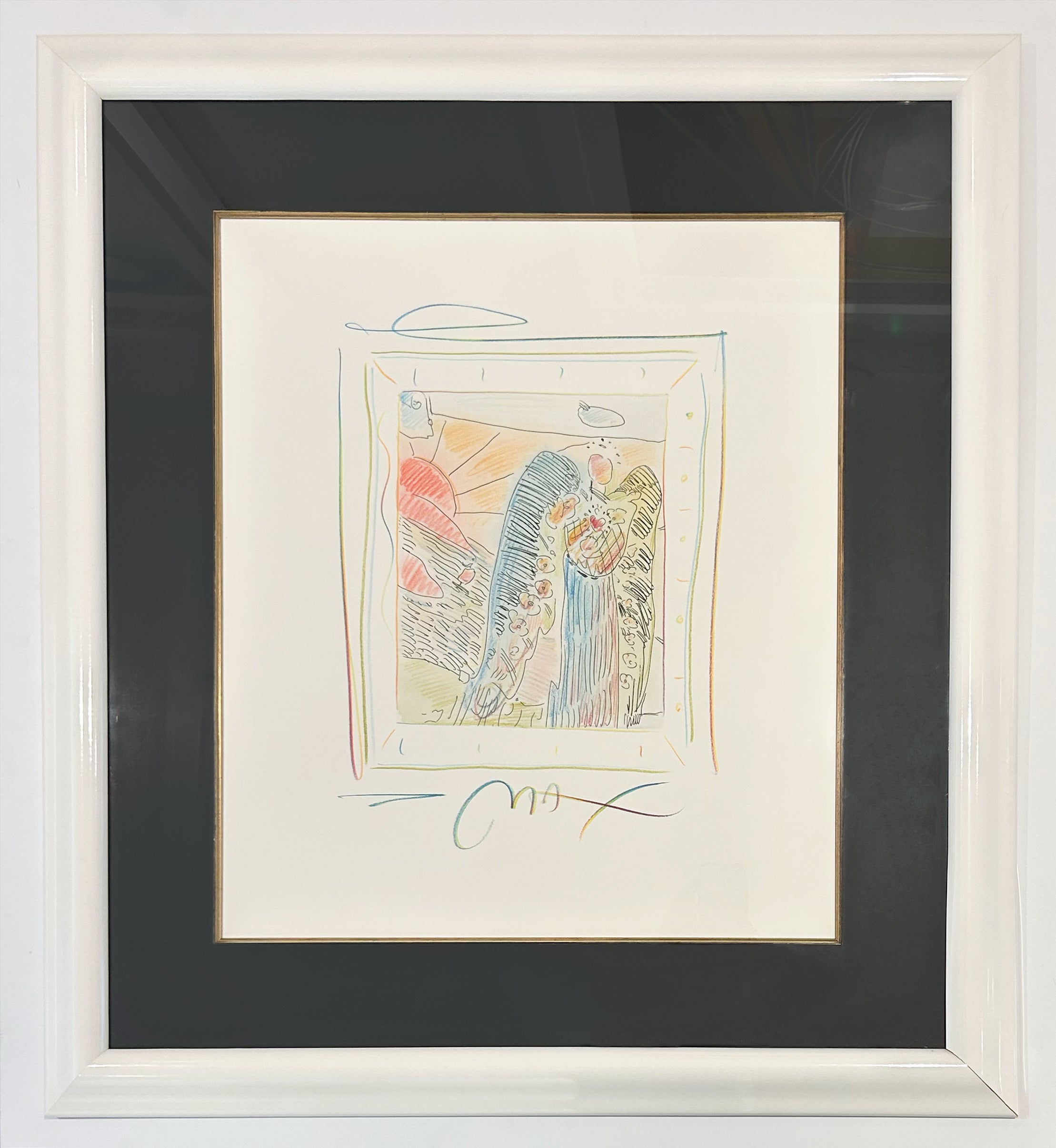 Angel with Heart stands as a luminous testament to Peter Max's signature visual language, combining the spiritual transcendence and exuberant color that have defined his artistic practice since the 1960s. This unique etching with hand-finished mixed media elements presents an ethereal angelic figure cradling a vibrant heart, rendered in Max's characteristic layering of bold chromatic passages and flowing, organic forms. The work captures the artist's enduring fascination with the intersection of the mystical and the joyful, where celestial imagery becomes a vehicle for expressing universal themes of love and hope. Created in 2003, the piece measures 21 1/4 by 18 inches in image size and arrives in a handsome 32 by 39 inch frame, making it an impactful presence suitable for a prominent wall placement. As a one-of-a-kind work, Angel with Heart represents the artist's continued commitment to hand-finishing techniques that elevate each print into a singular object. The combination of etching and mixed media allows for textural depth and luminosity that distinguishes this piece from mass-produced works, while the artist's signature confirms its authenticity and importance within Max's mature body of work. For collectors drawn to contemporary spirituality, vibrant expressionism, and works by an artist whose influence on American visual culture remains substantial, this Angel with Heart offers both aesthetic appeal and meaningful symbolism at an accessible price point.