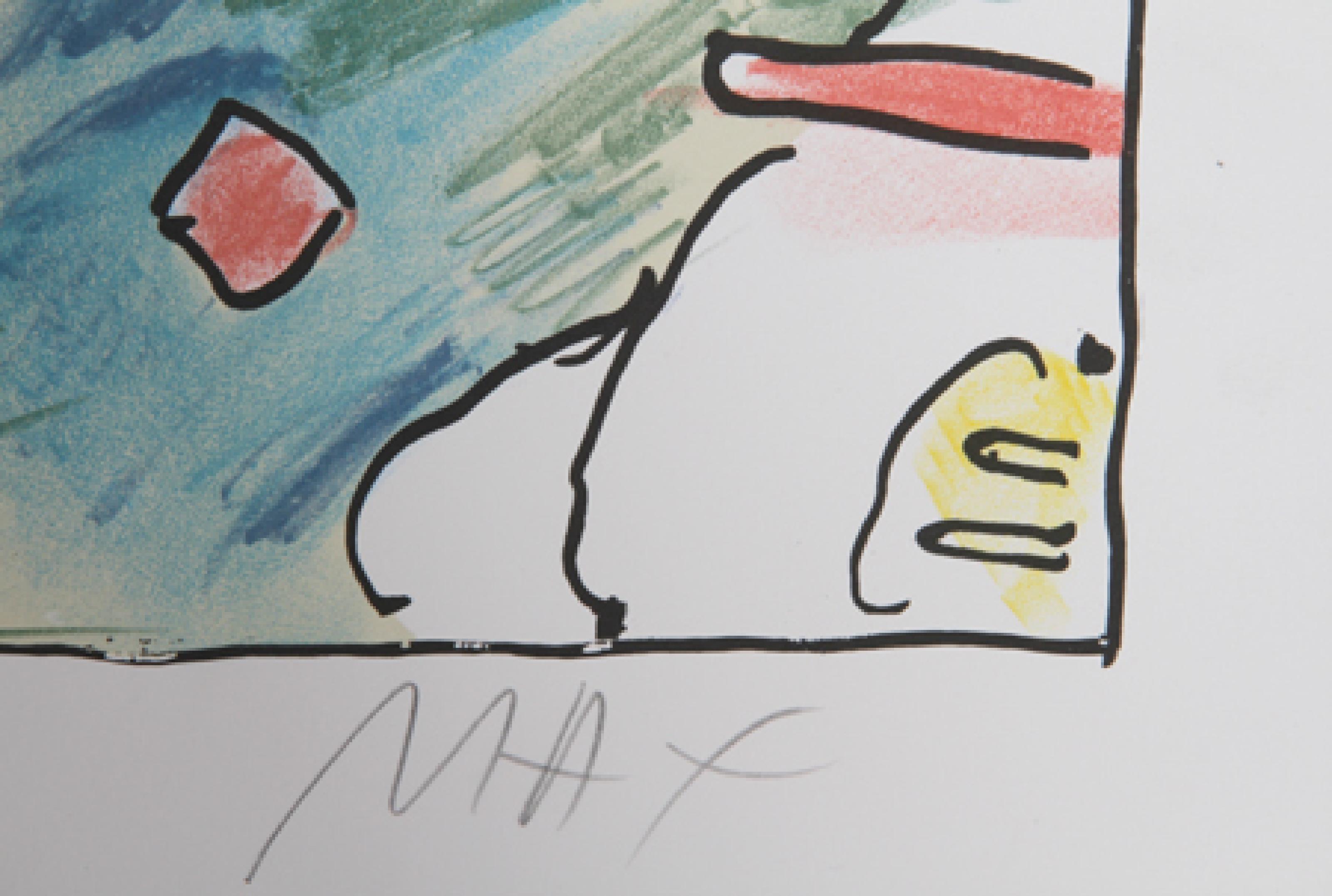 A vibrant lithographic work by Peter Max exploring abstract floral forms. The piece exemplifies Max's characteristic bold colors and dynamic compositional style.