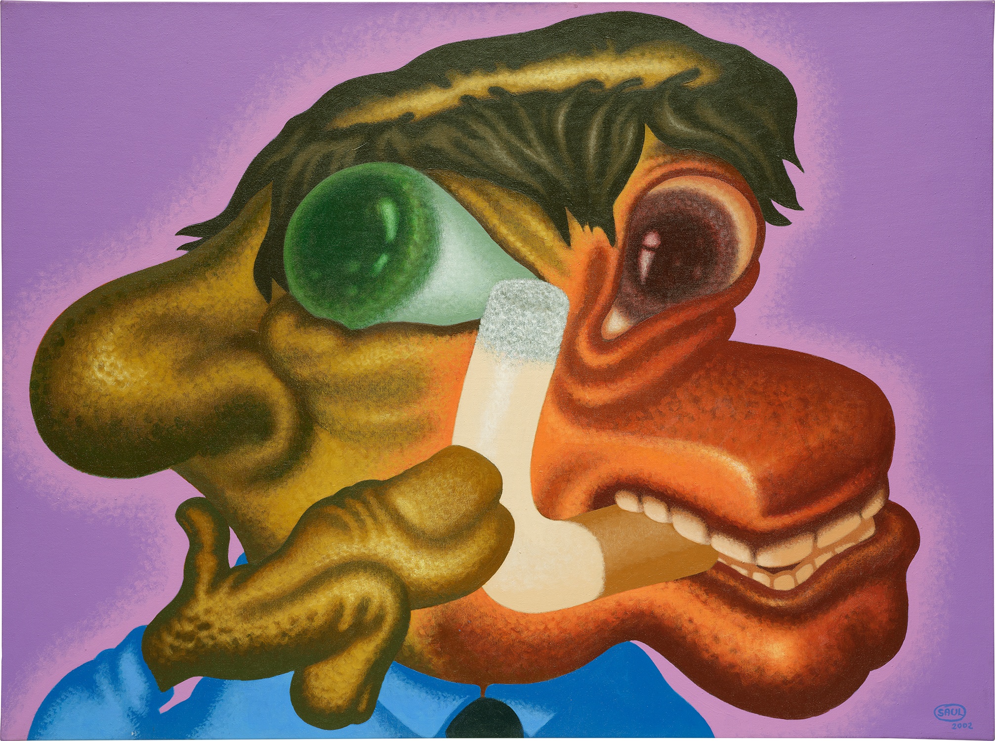 Peter Saul's 2002 acrylic work presents a surreal and psychologically charged scene exploring themes of choice and consequence. The painting's vivid, expressionistic style conveys emotional intensity through bold color and distorted figuration.