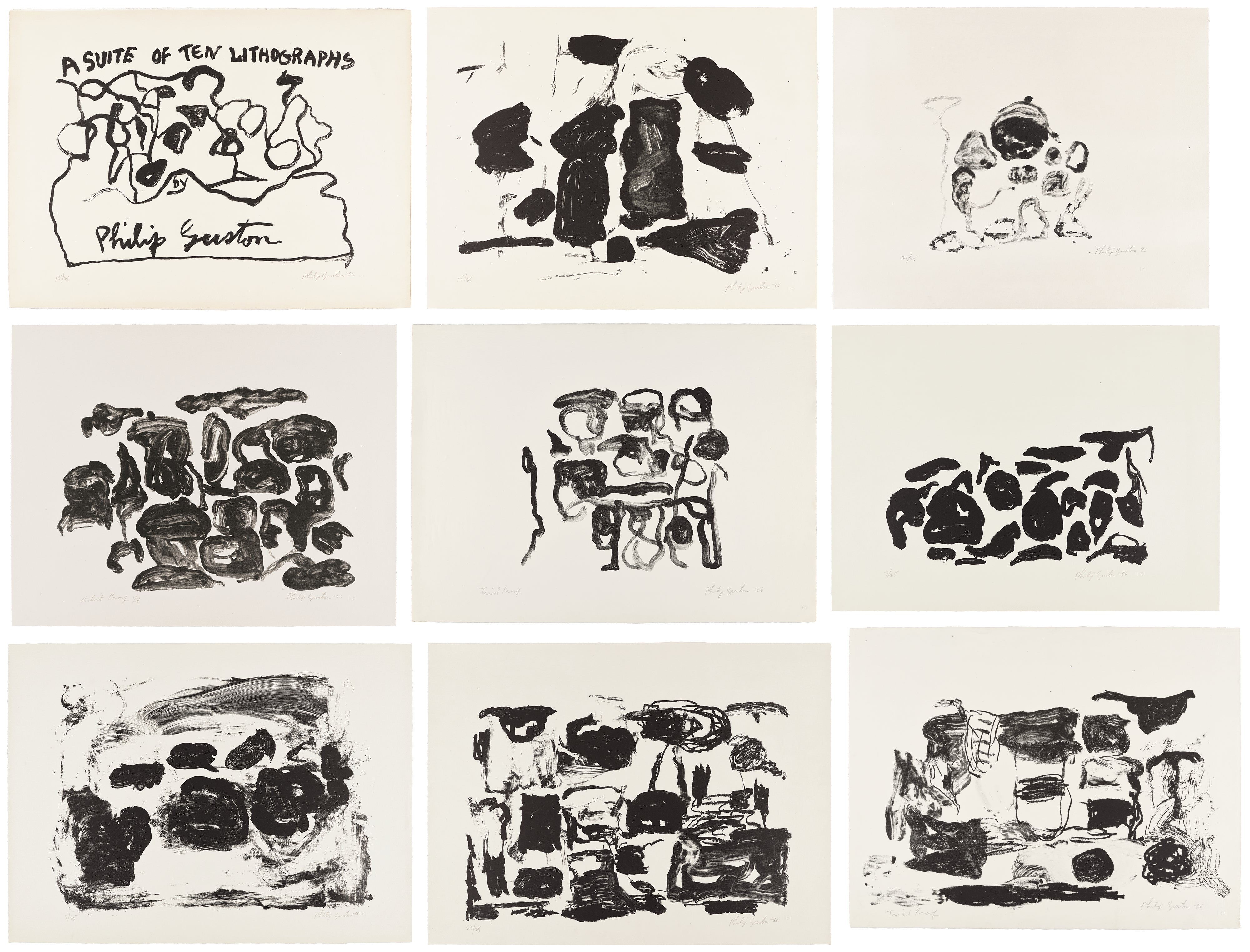 Philip Guston's suite of nine lithographs (lacking plate 4) demonstrates his expressive printmaking technique with varied signatures and numbering indicating an edition of 25 with artist's proofs. Published by Hollanders Workshop in New York, these unframed works showcase Guston's dynamic compositional approach.