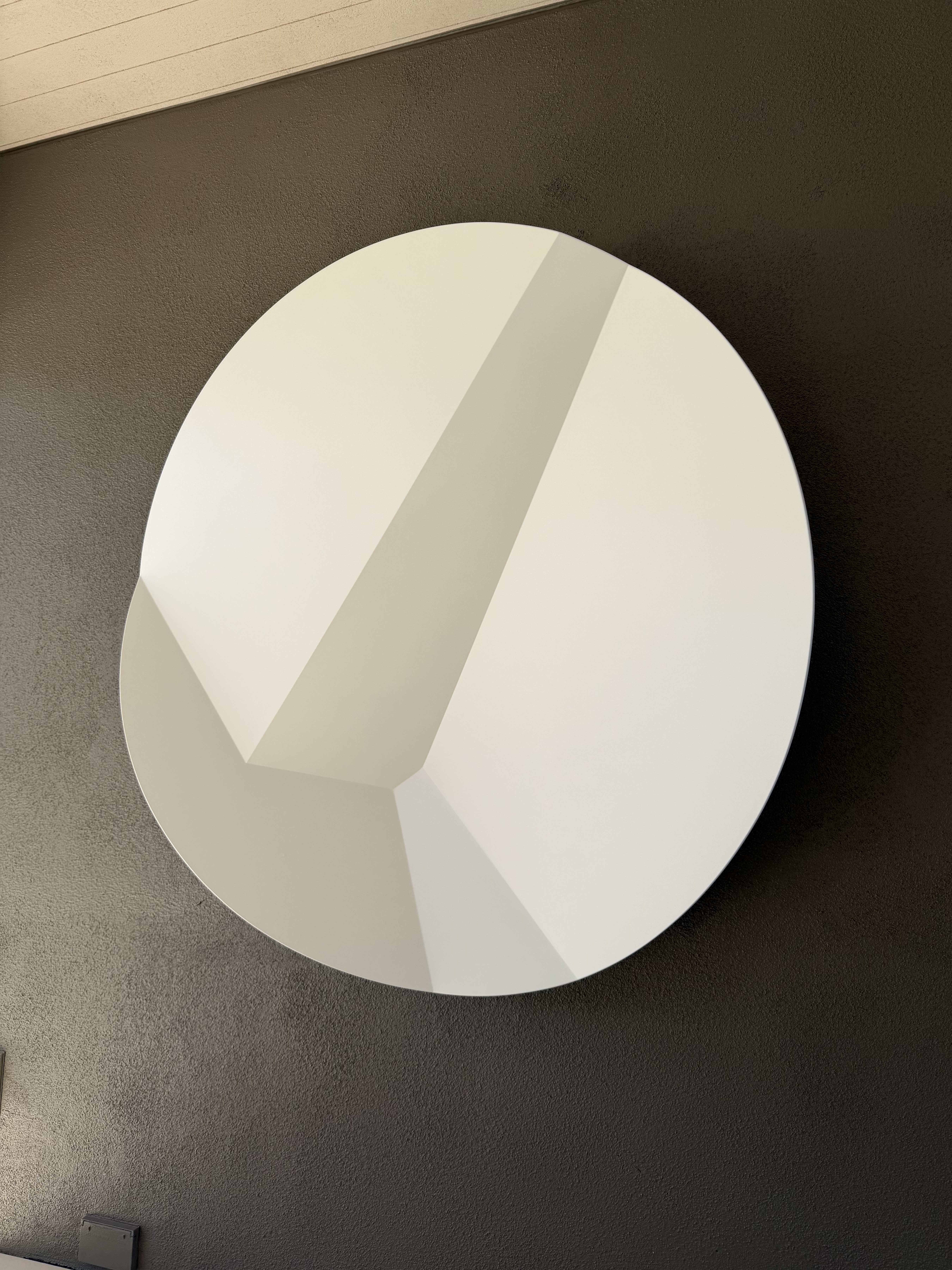This circular wall-mounted sculpture from Phillip K. Smith III's acclaimed 'Faceted Discs (Light and Shadow Works)' series explores the interplay of geometric forms, light, and perception. The work features subtle faceted planes in white and off-white tones that create dimensional depth through shifting shadows and highlights. Smith's minimalist approach transforms a simple circular form into a dynamic study of spatial relationships and optical phenomena.