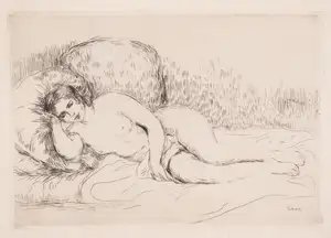 This etching by Renoir depicts a reclining female figure turned toward the left, showcasing the artist's characteristic soft handling of form and intimate subject matter. Created in 1906 and published in Theodore Duret's history of Impressionist painting, the work demonstrates Renoir's continued engagement with printmaking despite his primary reputation as a painter. The delicate etched lines and warm tonal qualities reflect the Impressionist sensibility that defined his artistic practice throughout his career.